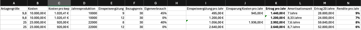 Das ist aber schon sehr schöngerechnet, vorallem der Eigenverbraucht. Schon 45% (4.500 KWh) bei der 9,8 KWp Anlage sind extrem unrealistisch, und 40% (8.800 KWh) bei der 25 KWp Anlage erst recht.