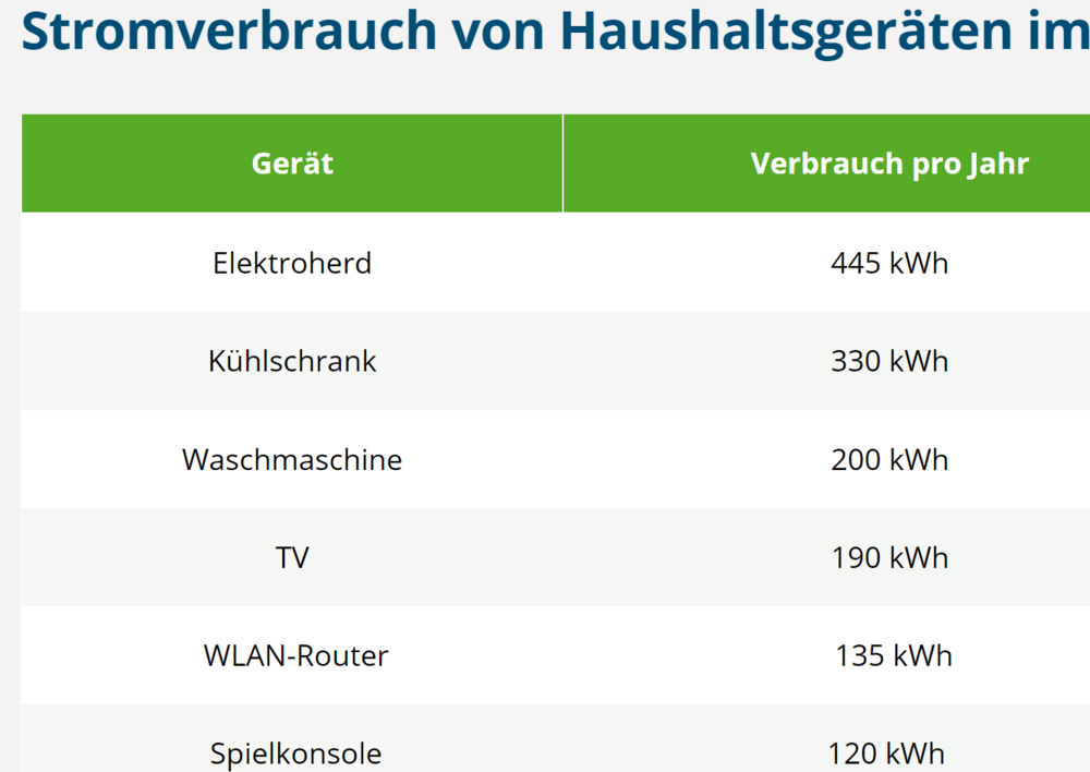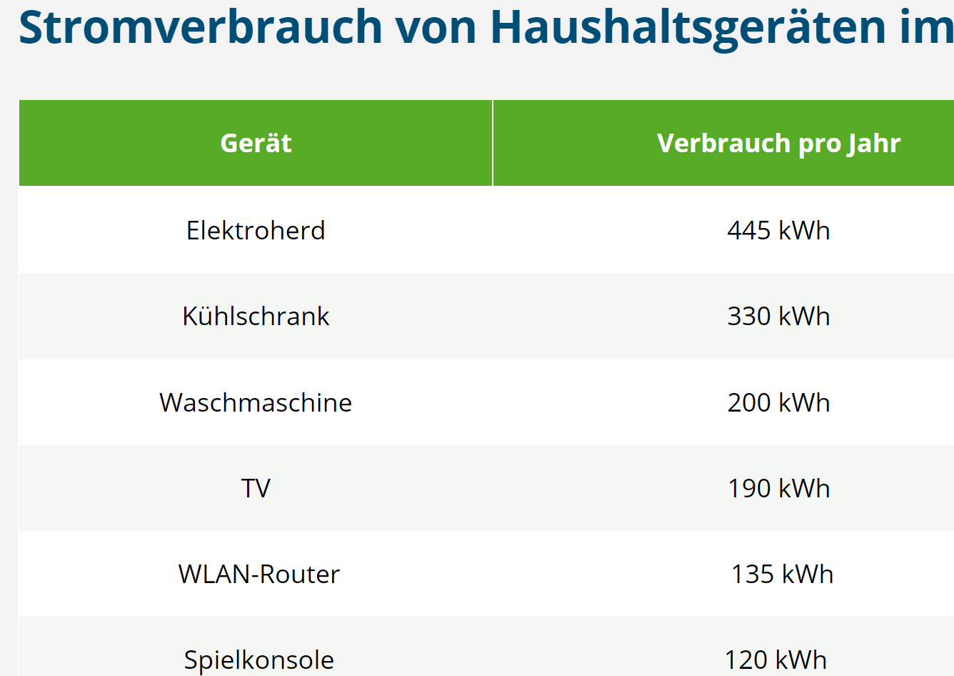 Für etwas ältere Geräte sieht man hier den Überblick. Bei Kühlschrank, Waschmaschine und WLAN-Router kannst Du die Werte fast halbieren für moderne Geräte. Beim Herd leider nicht, weil der Hitze produzieren muss.