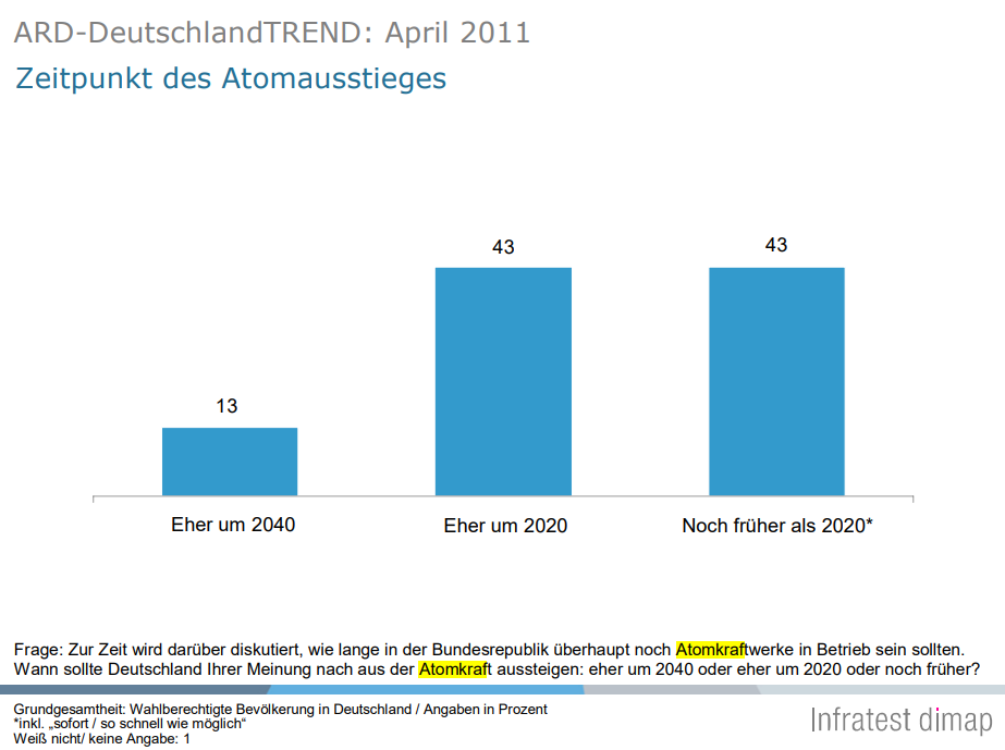 Ich war 2011 auch gegen den hektischen Ausstieg (eher um 2040 Minderheit), aber perspektivisch schon dafür irgendwann auszusteigen.