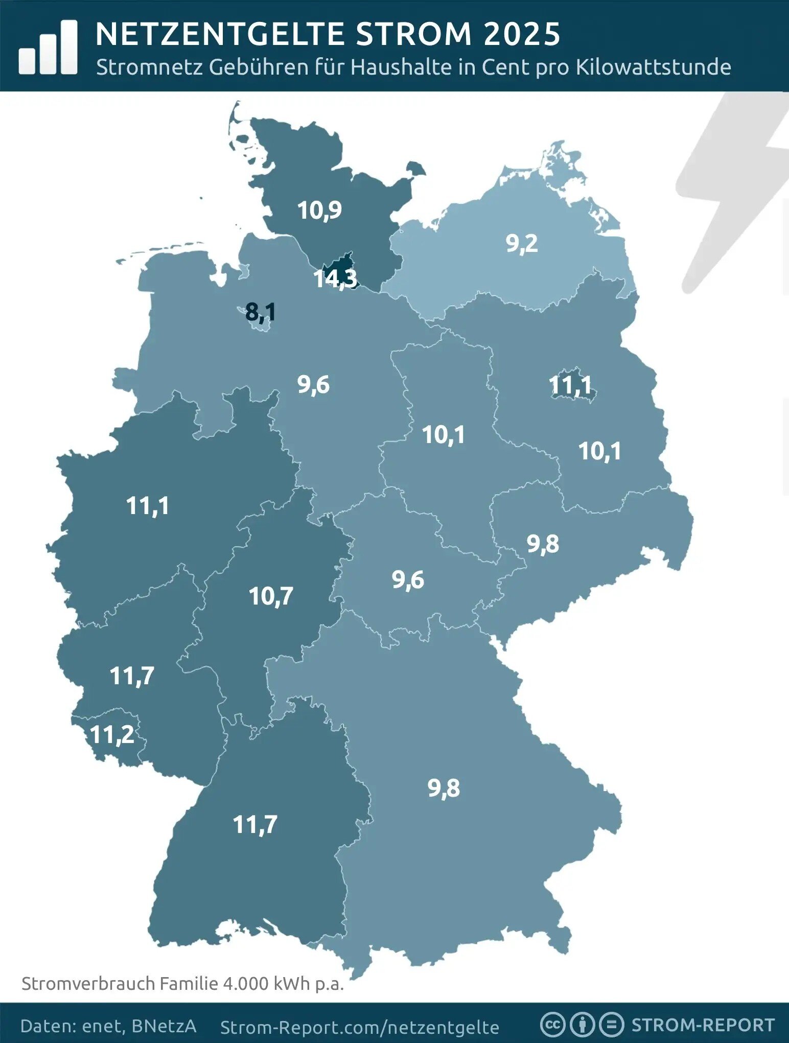 Z.B. Mecklenburg Vorpomern, Schleswig-Holstein, Brandenburg  (Wind) aber auch Bayern (Solar) muss weniger bezahlen. Insbesondere im Westen Deutschlands ist das Netzentgelt jetzt am höchsten. Das Netzentgelt ist etwa gleich hoch wie die reinen Stromerzeugungskosten.