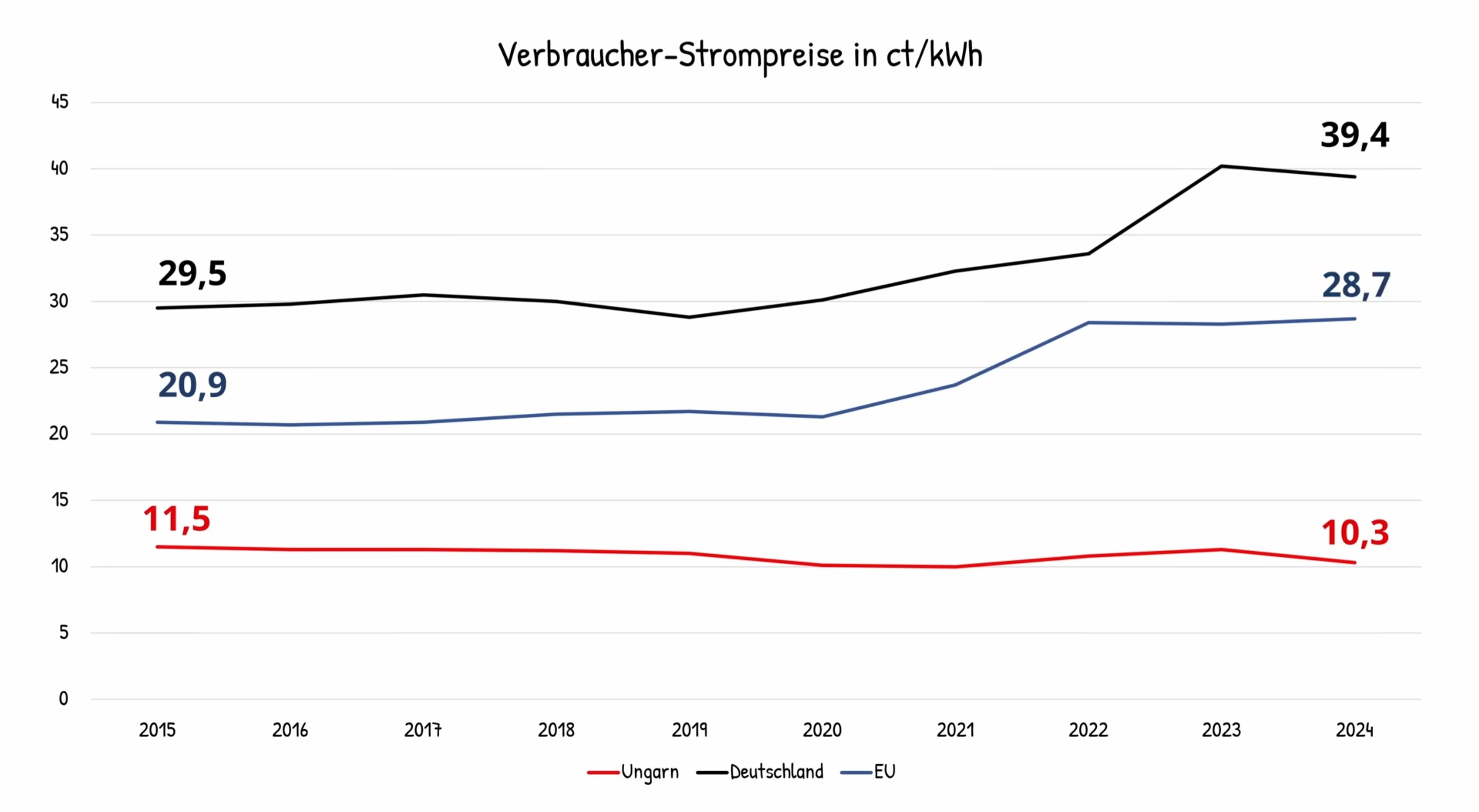 In Ungarn wird der private Haushaltsstrom subventioniert und die Industrie zahlt mehr. In Deutschland zahlen die privaten Haushalte für billigeren Industriestrom, der aber auch nicht günstiger als in Ungarn ist. Ich glaube nicht, dass China ihre Solarzellen in Ungarn billiger verkauft, deshalb hilft das geringere Lohnniveau nur bedingt.