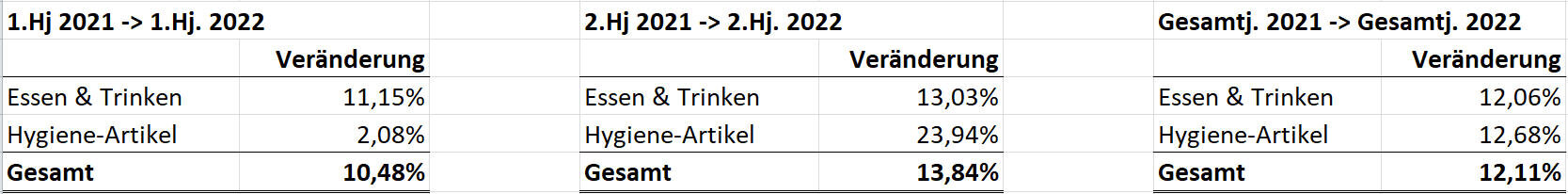 Über das Gesamtjahr 2022 gibt es bei mir also eine Preissteigerung von etwas über 12% bei Lebensmittel und Haushalts- bzw- Hygiene-Artikel.