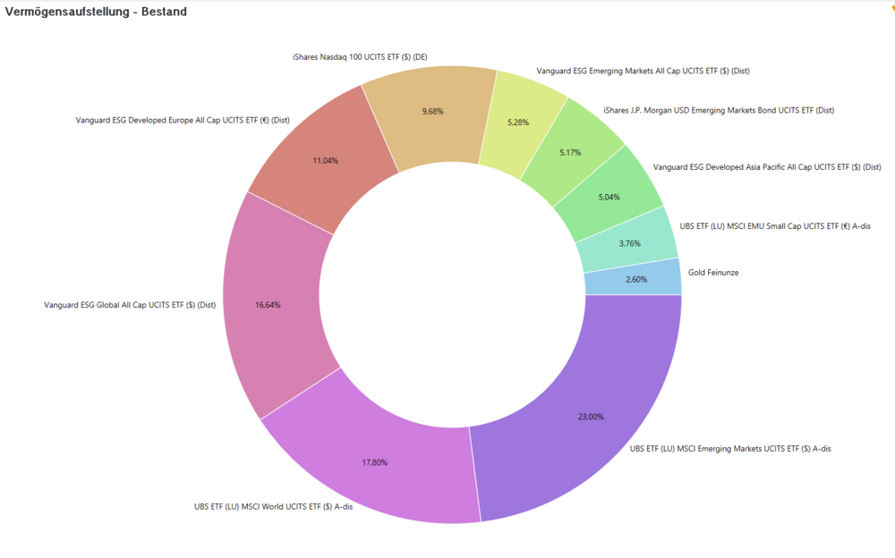 EddisHerrchen Dezember 31, 2023 · bearbeitet Dezember 31, 2023 von EddisHerrchen Tippfehler korrigiert Hallo Foristen, es wird Zeit für das obligatorische Jahresendupdate für 2023. Es fehlt noch eine Ausschüttung des iShares J.P. Morgan USD EM Bond vom 29.12. - erfahrungsgemäß braucht die ING da etwas, und rechnet dann in der ersten Woche mit Valuta zum 29.12. ab. Die ist also in den PP Kennzahlen noch nicht drin, sollte sich aber nicht wirklich groß bemerkbar machen. Es sind im Q4/23 rund 1.895 € (+ca 260€ noch ausstehende Abrechnung) Ausschüttungen erfolgt. Damit bin ich im Gesamtjahr 2023 bei 17.955 € (+260), also knapp über 18 t€ Ausschüttungen, dazu kommen noch 730 € Zinserträge auf dem Tagesgeld. Im Q4 habe ich kurzentschlossen einen deutlichen Rücksetzer der Europa ETFs genutzt um den letzten Lyxor ETF (Lyxor Core STOXX Europe 600 (DR) UCITS ETF Acc) zu tauschen gegen Vanguard ESG Developed Europe All Cap (Dist). Ich habe dabei Gewinne realisiert und dafür 3600 Euro Steuern gezahlt. Damit bin ich jetzt komplett aus Amundi/Lyxor ETFs raus. Gekauft wurde sonst nur noch 210,x iShares J.P. Morgan USD EM Bond UCITS ETF (Dist) über Sparplan und Einmalkauf. Depotbestände zum 31.12: World Vanguard ESG Global All Cap UCITS ETF (Dist) 40.000 Stk IE00BNG8L385 UBS ETF (LU) MSCI World UCITS ETF (USD) A-dis 700 Stk LU0340285161 USA iShares Nasdaq 100 UCITS ETF (DE) 700 Stk DE000A0F5UF5 Emerging Markets UBS ETF (LU) MSCI Emerging Markets UCITS ETF (USD) A-dis 3.000 Stk LU0480132876 Vanguard ESG Emerging Markets All Cap (Dist) 10.000 Stk IE0001VXZTV7 iShares J.P. Morgan USD EM Bond UCITS ETF (Dist) 610,x Stk IE00B2NPKV68 Europa Vanguard ESG Developed Europe All Cap (Dist) 25.000 Stk IE000NRGX9M3 UBS ETF (LU) MSCI EMU Small Cap UCITS ETF (EUR) A-dis 400 Stk LU0671493277 Pacific Vanguard ESG Developed Asia Pacific All Cap (Dist) 10.000 Stk IE0008T6IUX0 Gesamt wurden in diesem Jahr 282 t€ investiert und der Cashbestand um 42 t€ erhöht. Dabei ist eine Erbschaft mit 240 t€ als Sondereffekt eingeflossen. Das Börsenjahr selbst war sehr gut und hat die schlechte Performance von 2022 ausgeglichen. Zum Jahresschluß liegen die Depots bei 1.141t€ Hier die Werte aus PP: Hier die Aufteilung auf die verschiedenen ETFs und die Asset Allokation für das Gesamtvermögen - wie immer ohne die eigene Immobilie. Aus meiner Perspektive ein verrücktes Depotjahr mit einem unheimlichen Volumenboost. Wie im letzten Jahr wünsche ich Euch für 2024 eine gesundes neues Jahr und ein gutes Börsenjahr 2024. Gruß Eddisherrchen Diesen Beitrag teilen Link zum Beitrag
