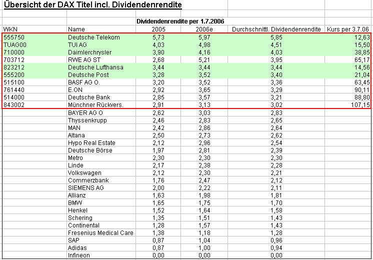Onassis Juli 14, 2006 · bearbeitet Juli 14, 2006 von Onassis Hier nun die Aktien, welche per 1.7.2006 in die Dividendenstrategie fallen: Die grün angemarkerter Aktien wurden per 1.7.06 ins Depot gelegt. Rot eingerahmt die 10 Aktien mit der höchsten Dividendenrendite; grün gekennzeichnet die 5 Aktien mit dem niedrigsten Kurs DivDAX: Desweiteren wurde per 1.7.06 das Zertifikat CB5259 ins Depot gelegt Aktives Handeln: Hier wurden ebenfalls die grün eingerahmten Aktien per 1.7.06 erworben. Der erste Verkauf findet statt, wenn der 200 Tage Durchschnitt nach unten durchbrochen wird. Onassis Diesen Beitrag teilen Link zum Beitrag