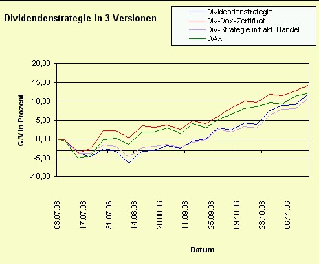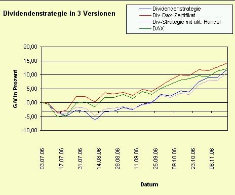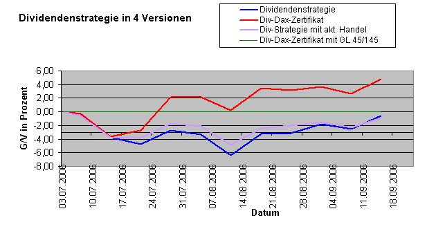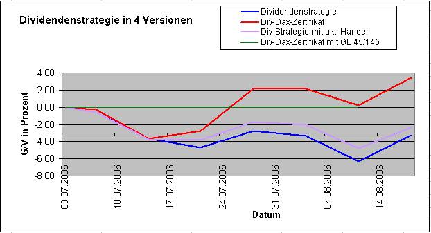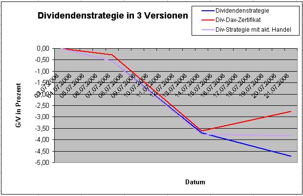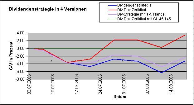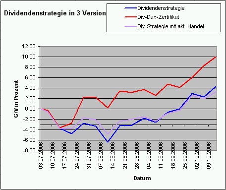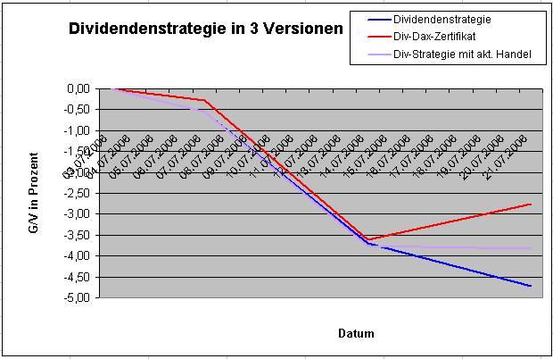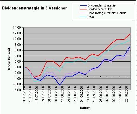 Onassis Juli 21, 2006 Nach einer Woche muss ich doch hier etwas schreiben! Es ist erstaunlich und ich hätte niemals damit gerechnet: Die Dividendenstrategie ist im Minus mit -4,72%. Die Strategie mit dem DivDAX-Zertifikat hat eine negative Rendite von "nur" -2,75%. Innerhalb einer Woche haben sich diese zwei Varianten so weit auseinanderbewegt! Erstaunlich! Onassis Diesen Beitrag teilen Link zum Beitrag