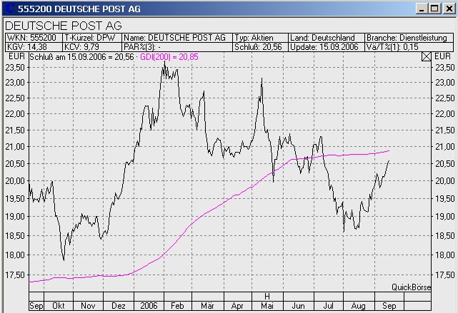 Onassis September 17, 2006 Die DivDAX Strategie führt die Rangliste immer noch an. Mehr gibts dazu nicht zu sagen. Anders bei der Deutschen Post. Der Kurs nähert sich dem 200er Durchschnitt. Bei einem Durchbrechen nach oben wird die Aktie wieder ins Depot aufgenommen. Ansonsten gilt: Gut Ding will Weile haben! Onassis Diesen Beitrag teilen Link zum Beitrag