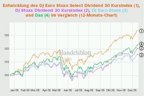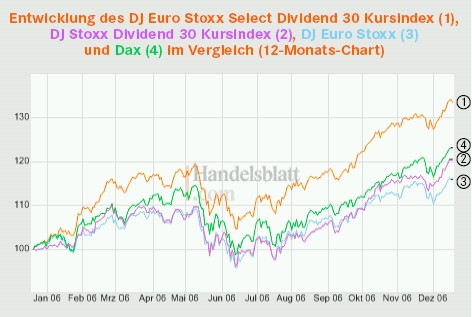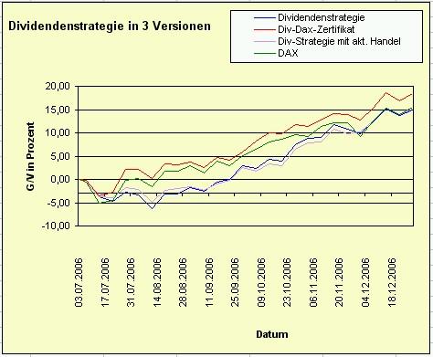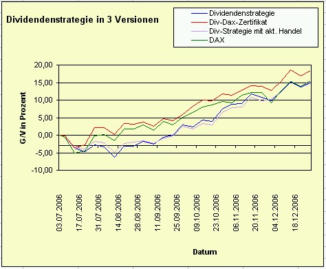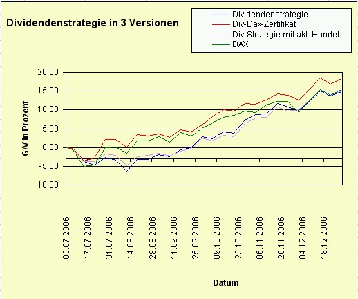 Onassis Januar 7, 2007 Auch hier ist es leider so, das die Daten von Quickbörse komplett hinüber sind. Ich werde den Versuch einstellen und ebenfalls ein kurzes Fazit ziehen, soweit es bei diesem geringen Zeitraum überhaupt möglich ist. 1. das DivDAX-Zertifikat lag immer an erster Stelle. 2. Das DivDAX-Zertifikat hat auch immer den DAX outperformed 3. Kosten: das DivDAX-Depot hat durch den einmaligen Kauf die geringsten Kosten verursacht. Es folgten die Dividendenstrategie (Kauf von 5 Papieren) und dann mit großem Abstand die Strategie "Dividenden-Strategie mit aktivem Handel". 4. Einfachheit. Ein Kauf vom Div-DAX Zertifiakt entbindet mich komplett von der Überwachung, welche Aktien ins Depot gehören. Denn der DivDAX-Index wird automatisch alle 3 Monate an die besten Aktien angepasst. Zusammenfassen kann ich sagen: Diejenigen, die nach der Dividendenstrategie auf den DAX handeln wollen, sind definitiv am Besten mit dem DivDAX-Zertifikat bedient. Es gibt nur Vorteile! Zu empfehlen ist das DivDAX Zertifikat der Commerzbank, WKN: CB5259 Falls jemand selbst Div-DAX-Zertifikate raussucht, muss er drauf achten, das sie auf den Performance-Index gerechnet werden und nicht auf den Kursindex. Onassis Diesen Beitrag teilen Link zum Beitrag