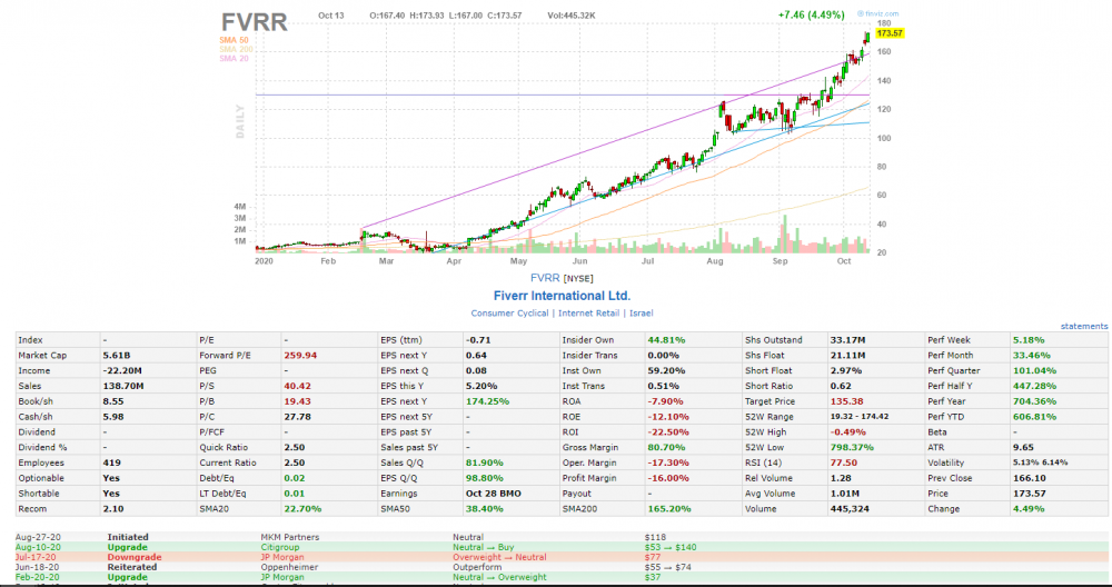 herbert_21 Oktober 13, 2020 · bearbeitet Oktober 13, 2020 von herbert_21 Zitat What does Fiverr do? Our mission is to change how the world works together. We started with the simple idea that people should be able to buy and sell digital services in the same fashion as physical goods on an e-commerce platform. On that basis, we set out to design a digital marketplace that is built with a comprehensive SKU-like services catalog and an efficient search, find and order process that mirrors a typical e-commerce transaction. The Fiverr platform connects businesses with freelancers offering digital services in hundreds of categories, across multiple verticals including graphic design, digital marketing, programming, video, animation and more. Ticker: NYSE:FVRR WKN: A2PLX6 ISIN: IL0011582033 oder 11V Market Cap 6,125B EPS (TTM)-2,29 Earnings Date: Oct 27, 2020 1y Target Est: 135,38 2021 Fwd P/E: 260 Angestellte: 419 - Investor Relations und Financial Documents - Infos zum 400M 0% Convertible Bond - Morningstar: http://financials.morningstar.com/ratios/r.html?t=11v 6M Chart und Price Target (Quelle: https://finviz.com/quote.ashx?t=FVRR) Diesen Beitrag teilen Link zum Beitrag
