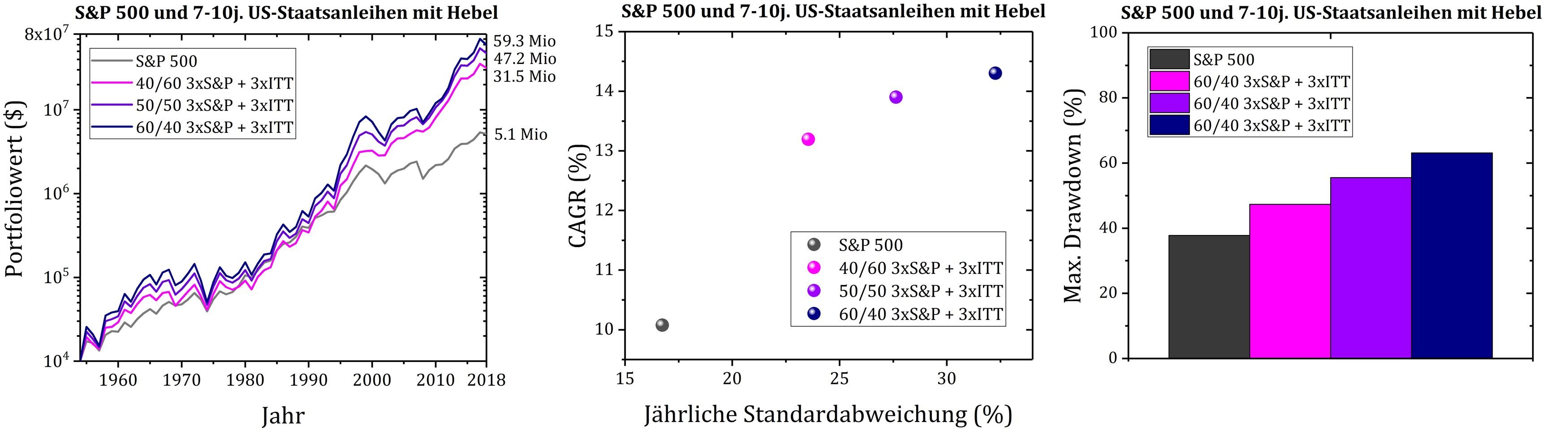 Mit Anleihen im Gepäck lassen sich auch deutlich höhere Gesamthebel realisieren. Unter UCITS dürfen keine ETFs mit Hebeln höher als 2 existieren. WisdomTree bietet aber 3-fach gehebelte ETNs an, unter anderem auf den S&P, Nasdaq und 10-jährige Staatsanleihen. Man muss sich bewusst sein, dass ETNs kein Sondervermögen sind. Im Gegenteil, man hat hier ein massives Emittentenrisiko. WisdomTree schreibt dazu in diesem Beitrag einiges. In der letzten Finanzkrise hat sich gezeigt, das sowas sehr schlecht enden kann. Meiner Meinung nach sind ETNs aber durchaus dafür geeignet, um mit kleineren Portfolioanteilen (oder zu Beginn der Ansparphase größeren, die dann aber in 10-20 Jahren nur noch einen kleinen Teil des Gesamtportfolios ausmachen) solche Strategien zu realisieren - das muss aber jeder selbst wissen.