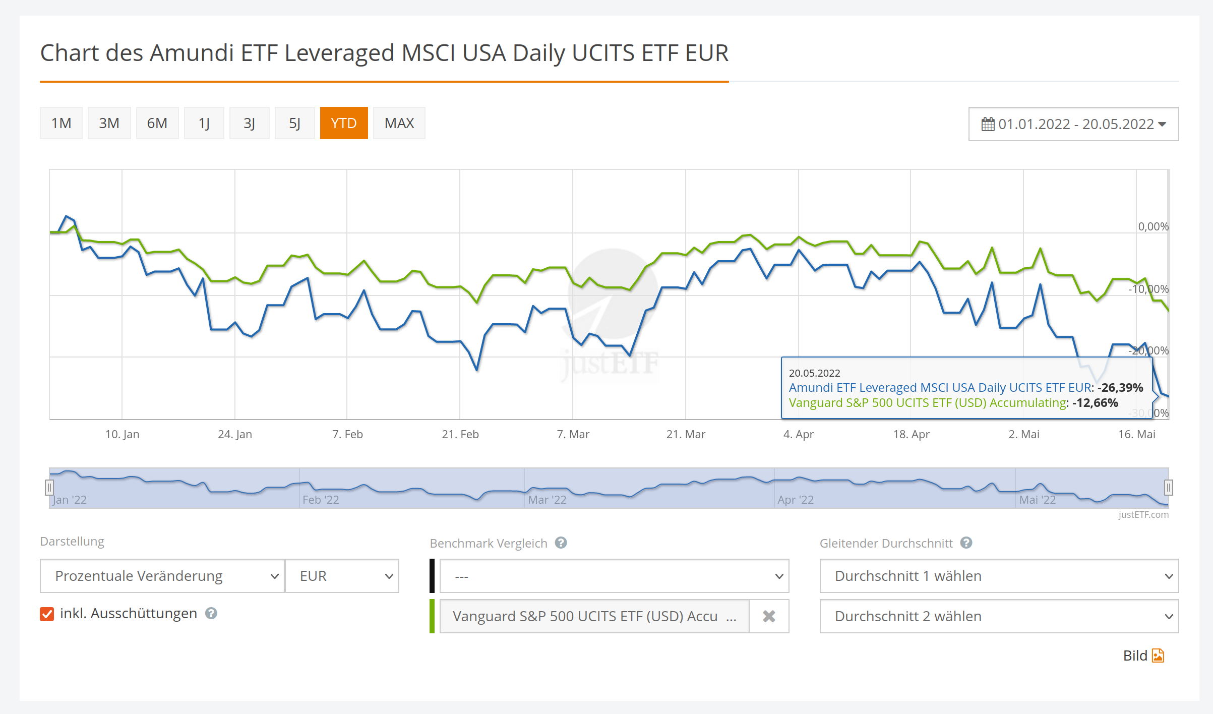 Wenn man aber den Vergleich also zwischen MSCI USA und dem 2x Leveraged (beide Amundi) wiederholt, kommt man aber auf ein Verhältnis von ziemlich exakt 1:2 YTD.