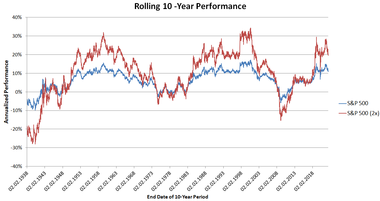 Thema Volatility Decay: im Laufe dieses Threads wurde ja schon einmal gepostet, dass trotz Volatiliy Decay der Erwartungswert eines per LETF gehebelten Investments unter Vernachlässigung der Kosten doppelt so hoch liegt wie bei einem Standard-ETF. Nur die Verteilung der Ergebnisse würde immer schiefer, sprich je höher der Hebel desto mehr wird es zu einer Form der Lotterie mit positivem Erwartungswert. In wenigen Fällen gewinnt man sehr viel, in den meisten Fällen verliert man ein wenig.