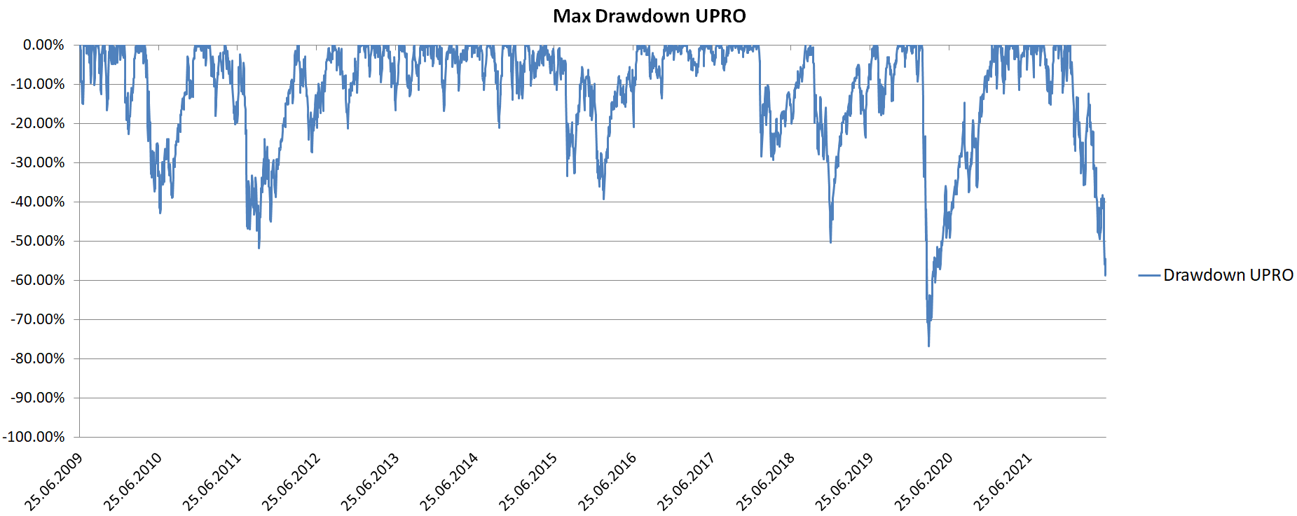 Insbesondere die Weltwirtschaftskrise ist 3x gehebelt einfach nur krass - mehr als drei Mal -90% in wenigen Jahren. Selbst wenn es nicht zu so einer extremen Krise kommt, ist Leveraged Buy-and-Hold nur was für extrem starke Nerven.