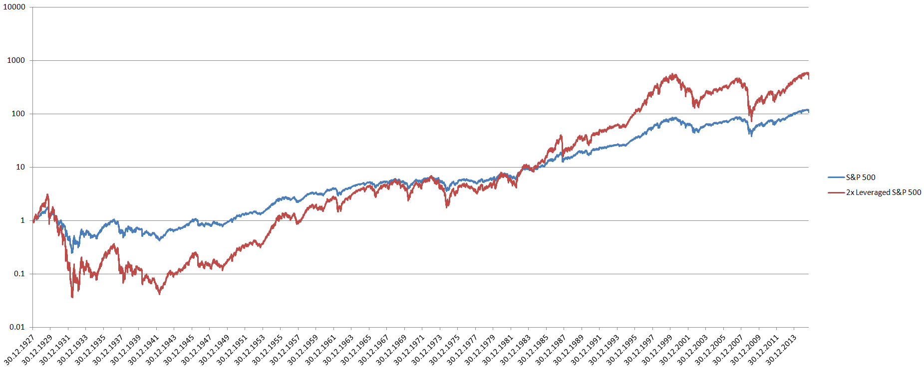 Ich finde es immer wieder interessant, die Historie des S&P 500 in gehebelter Form (hier 3x) anzuschauen: