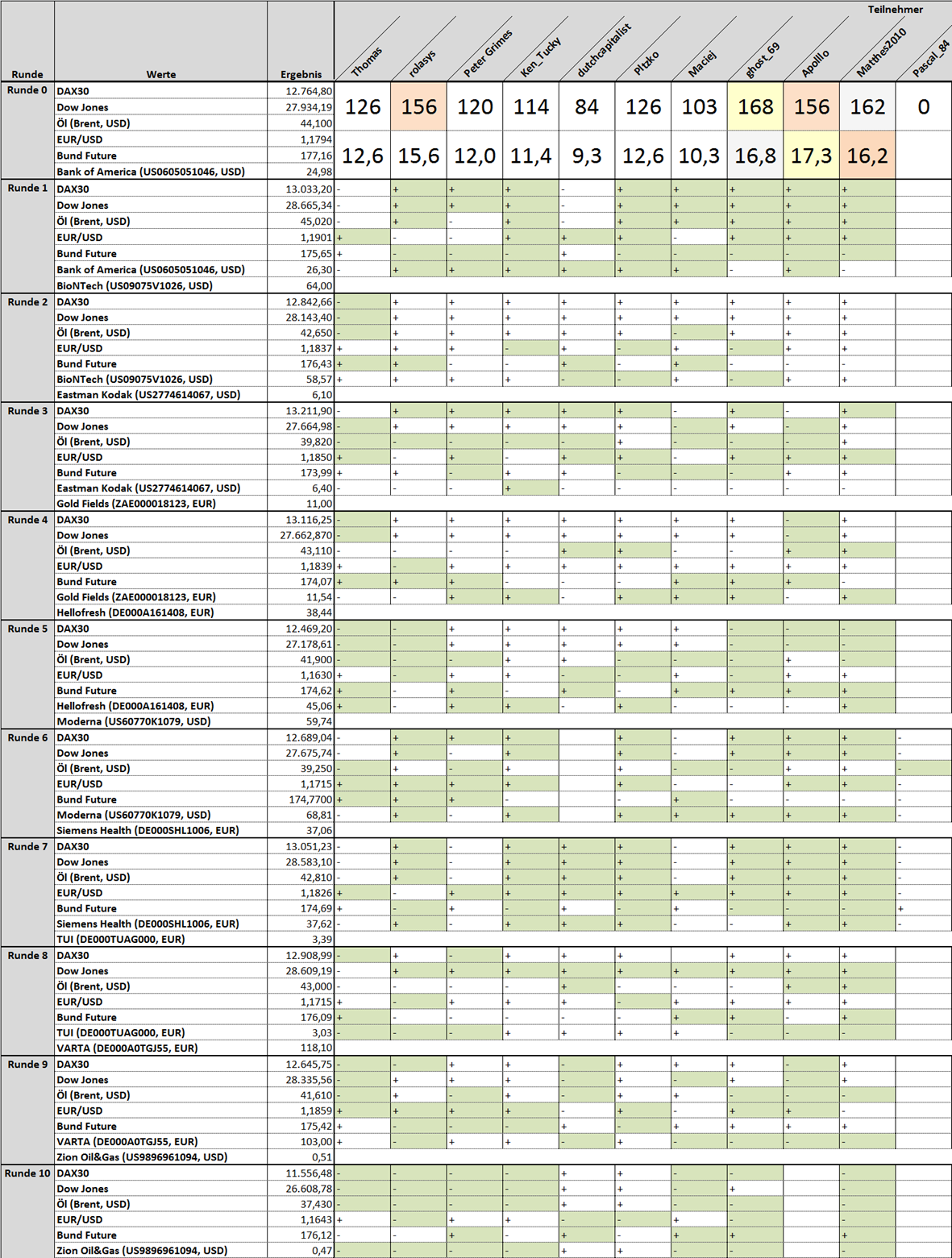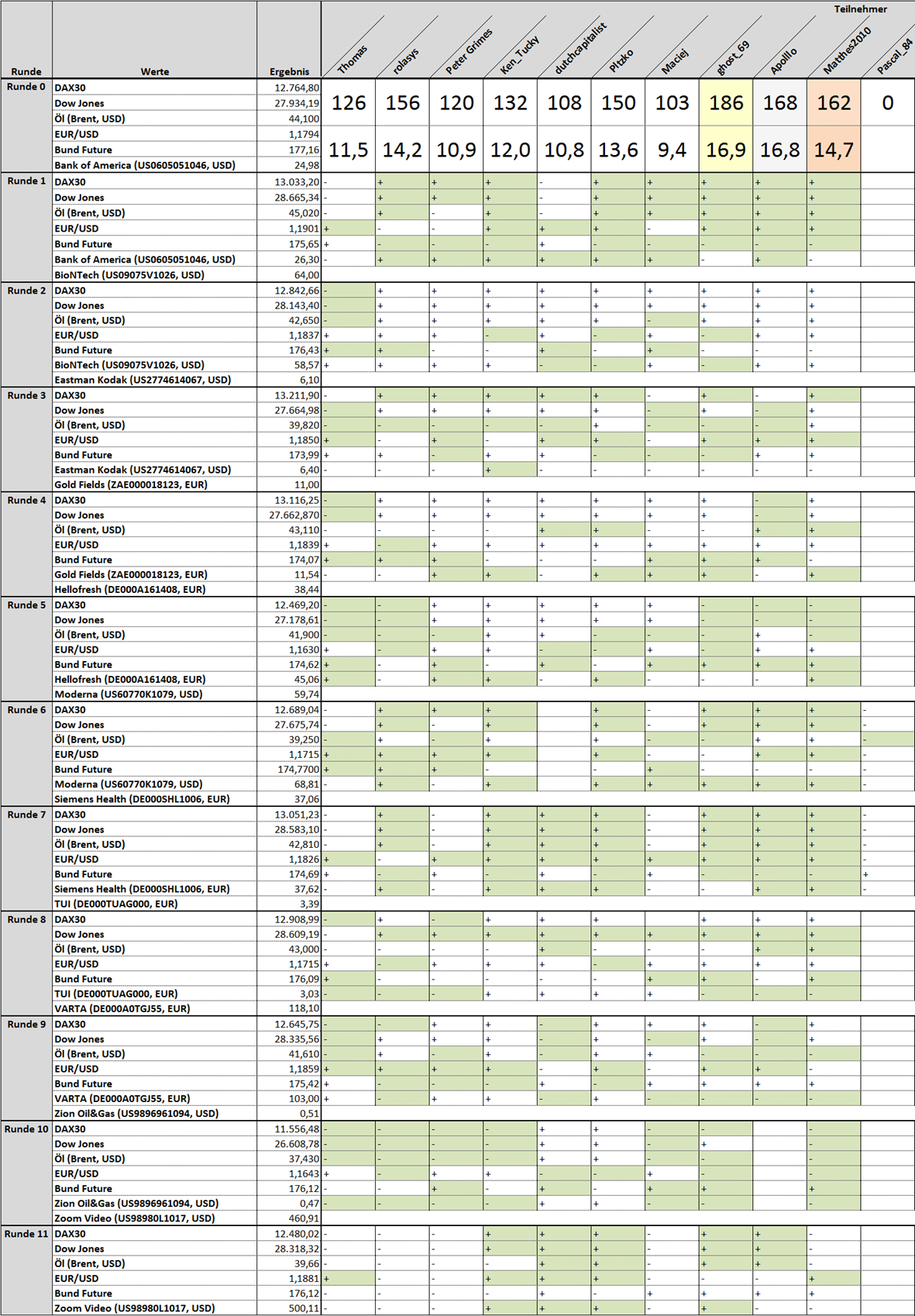 Thomas Oktober 30, 2020 Hallo zusammen, eine weitere Börsenwettrunde beginnt. Viel Spaß beim Wetten. Tippabgabe bis Montag 17:00 Uhr --> 11. Runde von 11 Runden. Neue Startwerte und Veränderung aus der letzten Runde: 1. DAX30: 11556,48 (-) 2. Dow Jones: 26608,78 (-) 3. Öl (Brent, USD): 37,43 (-) 4. EUR/USD: 1,1643 (-) 5. Bund Future: 176,12 (+) 6. Zion Oil&Gas (US9896961094, USD): 0,47 (-) 6. (Neu) Zoom Video (US98980L1017, USD): 460,91 Informationen: Erst Tippabgabe! Danach können weitere Beiträge verfasst werden. Anders herum wird disqualifiziert! Die ersten 5 Werte stehen während der ganzen Tippsaison fest. Der 6. Wert wechselt von Runde zu Runde. Vorschläge für einen 6. Wert werden jederzeit entgegengenommen. Es dürfen jederzeit auch neue Spieler einsteigen und sich am laufenden Spiel beteiligen. Regeln:https://www.wertpapier-forum.de/topic/368-regeln-und-informationen-für-die-börsenwette/ Fragen:https://www.wertpapier-forum.de/topic/1420-fragen-zur-börsenwette-hier-rein/ Bitte die Tipps im vorgegebenen Format abgeben! So sieht der richtige Code als Beispiel aus: [hide ] (hier das Leerzeichen noch entfernen vor "]") 1. + 2. - 3. - 4. + 5. + 6. - [/hide] Mein Tipp: Versteckter Inhalt Du kannst den versteckten Inhalt sehen, sobald du auf dieses Thema antwortest. Es wird nochmal ordentlich spannend. Insbesondere kommende Woche mit der US-Wahl. Diesen Beitrag teilen Link zum Beitrag
