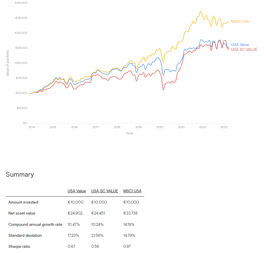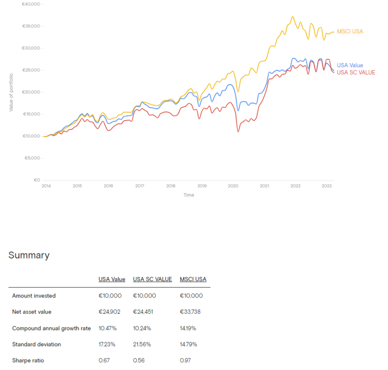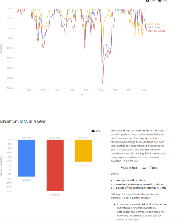 Hicks&Hudson Juni 1, 2023 · bearbeitet Juni 1, 2023 von Hicks&Hudson vor 28 Minuten von Johannes34567: Value bringt aber nur bei Small Caps wirklichen Mehrwert: Zumindest seit 2014 sah das dann leider so aus: https://curvo.eu/backtest/compare?config={"withTer"%3A"true"%2C"periodStart"%3A"2014-01"}&portfolios=NoIgqgygggBAagQwDYFcCmIA0xQEkCiADIQEIAiAjAGIAsAsjTVhQLptA%2C NoIgqgygggBBDCMBqUAyYCiIA0xQEkMAGIgIQgAVV4AWARgGYc6BdNoA%2C NoIgsgygwgkgBAVQgQRAGmKGBRADLgIQDZcIANARgHZd0KBdRoA Und ja, mir ist bewusst, dass dies alles MSCI Indizes sind mit Deinem angesprochenen Manko. Die Haupterkenntnis für mich wäre trotzdem, dass es auch hier kein Mehr an Rendite gibt, ohne gleichzeitig ein Mehr an Risiko einzugehen. Diesen Beitrag teilen Link zum Beitrag