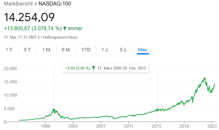 Glory_Days Juni 1, 2023 · bearbeitet Juni 1, 2023 von Glory_Days vor 9 Minuten von Hicks&Hudson: Seine Argumente für diese Art Investieren kann ich schwer enthebeln. Ein Blick auf die Historie des Nasdaq-100 würde dafür doch schon ausreichen? Natürlich ist das ein mit Hindsight-Bias selektiv ausgewählter Zeitraum (ohne Berücksichtigung von Dividenden) - aber es gab ihn in der Vergangenheit und wird ihn (möglicherweise in schlimmerer Form) in Zukunft wieder geben. Man sollte sich dessen einfach bewusst sein, dass er an dieser Stelle sehr wahrscheinlich einfach nur höheres Risiko eingeht (was selbstverständlich gut gehen kann). Diesen Beitrag teilen Link zum Beitrag