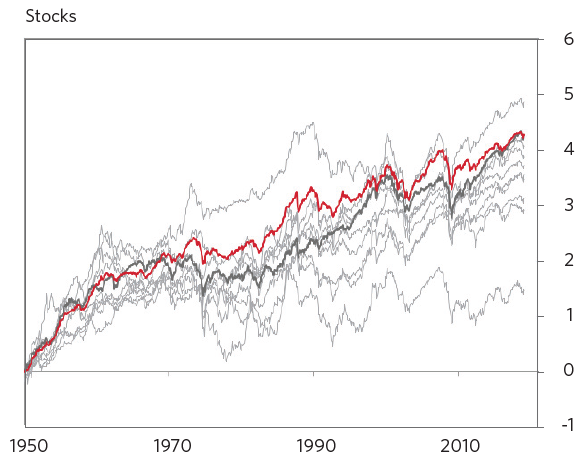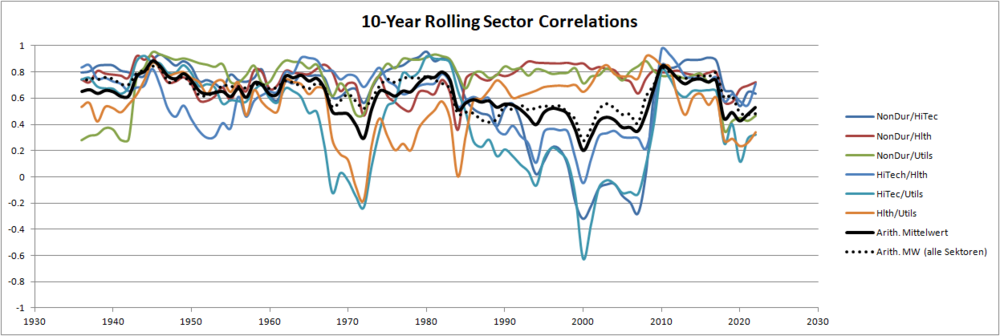 Glory_Days Juni 2, 2023 · bearbeitet Juni 2, 2023 von Glory_Days Zitat Im Gegensatz dazu ist mein Eindruck, dass die Rendite verschiedener Länder deutlich stärker schwankt - und deren Sektoren müssen als Mittelwert die Rendite ihres Landes-Aktienmarkts haben. Das hängt von der Gewichtungsverteilung der Sektoren ab - deine Aussage trifft näherungsweise auf Equal-Weight zu (der Rebalancing-Bonus kommt hier neben der gewichteten Summe der geometrischen Komponenten-Renditen (dem Strategic Return) noch obendrauf). Bei Marktkapitalisierung bzw. einer starken Abweichung von Equal-Weight könnte sich die Sektor-Rendite auch erheblich vom Rendite-Mittelwert aller Sektoren entkoppeln (hinsichtlich der Sektoren, die nur mit einem sehr geringen Gewicht in den Mittelwert einfließen). Vermutlich würde das übergelagerte systematische Länder-spezifische Risiko ein höheres Gewicht haben, sodass selbst international florierende Sektoren ein Problem bekommen, wenn sich dieses nationale Risiko materialisiert (Taiwan und die Chipindustrie könnte bald so ein Beispiel werden - hoffen wir es mal nicht). vor 4 Stunden von Saek: Du hast doch Daten zu den US-Sektoren Die schwanken langfristig um wenige Prozent um die langfristige US-Rendite, oder? Hier schaut man für einen schnellen Überblick wohl am besten auf die kumulativen Renditen in Log-Darstellung. Als Vergleich habe ich den S&P Composite Index (Shilller) hinzugefügt, der der den S&P 500, den S&P Mid Cap 400, und den S&P Small Cap 600 kombiniert (Dividenden wurden reinvestiert). Die Darstellung gefällt mir sehr gut, da sie zeigt, dass die Fama/French-Daten zu den Shiller-Daten sehr gut passen und konsistent sind. Tatsächlich bildet sich hier ein eher enger "Schlauch", die Streuung der Sektoren um einen nach MK-gewichteten Index ist eher gering und zeitlich einigermaßen konstant - wie es scheint. Wobei ich bei der Frage der Zeitabhängigkeit eher ein Freund von rollierenden Korrelationen auf Jahresrendite-Basis bin. Denn kein Investor hat einen Anlagezeitraum von 100 Jahren, und die Dynamiken auf 10 bis 20-Jahreszeiträumen sind häufig viel entscheidender für Anleger (hier mal für die Kombinationen der Sektoren des OD-Portfolios sowie der Mittelwert für alle 10-Sektoren (45 Kombinationen)): Die durchschnittliche rollierende Sektor-Korrelation scheint seit der Dotcom-Krise zugenommen zu haben mit dem Höhepunkt auf der Finanzkrise und seitdem wieder abgenommen zu haben (was angesichts des systematischen und Sektor-spezifischen Risikos plausibel erscheint). Bei Ländern hingegen dominiert das systematische Risiko und Länder-spezifische Risiko die Korrelationen (siehe Renditeschaubild unten). Zum Vergleich für verschiedene Länder ein Graph aus Bridgewaters Paper 'Geographic Diversification Can Be a Lifesaver, Yet Most Portfolios Are Highly Geographically Concentrated' (leider sind die grauen Kurven nicht mit den Ländernamen beschriftet): Zumindest für den Vergleich US/Welt schwanken einzelne Länder wesentlich stärker als einzelne Sektoren. Ich vermute, dass das Bild mit einzelnen Branchen (also praktisch die Zerlegung eine der bunten Kurven des rechten Graphen) eher wie das linke Bild aussehen würde. Man kann natürlich argumentieren, dass alle Länder nur dann untergehen, wenn die Welt untergeht. Und alle Sektoren eines Landes untergehen, wenn das Land untergeht. Dagegen spricht nichts und ich halte das für plausibel. vor 4 Stunden von Saek: Es wäre noch zu verifizieren, dass die Schwankungsbreite ähnlich wie bei US-Sektoren eher klein ist. Wenn das so sein sollte, ist für mich klar, dass die Länder-Diversifizierung die Dispersion der Renditen stärker reduziert. Natürlich wird die Schwankungsbreite gegenüber der gewichteten Schwankungsbreite stärker reduziert, wenn die paarweise Korrelation der rebalancierten Komponenten geringer zueinander ist. Das sieht man in den Graphen oben mit bloßem Auge sehr gut und ist keine wirkliche Überraschung, sondern simple Mathematik. Die Frage ist, kann es ein Land mit geringer Schwankungsbreite (wie z.B. die USA) geben, bei denen die Schwankungsbreite der einzelnen Sektoren hoch ist? Oder ergibt sich für jedes Land qualitativ des gleiche Bild wie oben rechts für die USA? Diesen Beitrag teilen Link zum Beitrag