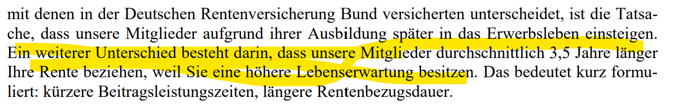 Das heißt, dass im Versorgungswerk ca. 15-30% länger und damit "mehr" Rente gezahlt werden muss. Als Gutverdiener in der GRV profitiert man von der relativen Kurzlebigkeit vieler Mitglieder in der GRV.