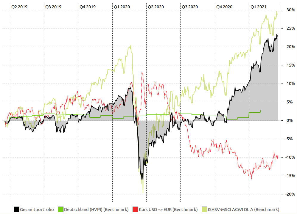s1lv3r November 20, 2020 · bearbeitet Dezember 29, 2021 von s1lv3r Aktuelle Performance 18.03.2019 bis 18.03.2021 (2 Jahre): Wie oben zu sehen, zur Zeit auf zwei Jahressicht -7% auf den MSCI ACWI als Benchmark. Da ich die Performance meines Depots über mein Gesamtvermögen inkl. RÜRUP-Verträge (~0,4% p.a. Nebenkosten) und Allianz bAV (Abschlusskosten und nur Garantieverzinsung) berechne ist das soweit okay für mich. RK3 Anteil über alles liegt bei ungefähr 80%. Es wäre allerdings für mich wünschenswert, wenn ich am ACWI performancemäßig langfristig "dranbleiben" würde. Wenn man nur den liquiden Anteil betrachten würde, sehe der Vergleich etwas besser aus: MSCI ACWI liquides Vermögen Gesamtvermögen --------- ----------- ------------------- ---------------- 1 Jahr 51,67% 58,63% 43,84% 2 Jahre 30,74% 30,63% 23,71% 3 Jahre 41,35% 30,27% 22,91% Aktuelle Depot-Entwicklung 18.03.2020 bis 18.03.2021: Danke für deine Meinung @HalloAktie. Der Krypto-Anteil hat sich aufgrund der Rally der letzten Tage mehr oder weniger spontan verdoppelt. Eigentlich sollte er kleiner sein. Langfristige angestrebte Asset-Allocation ist: 5% Einzelaktien 60% Aktienfonds 10% HY/EM-Anleihen 10% Immobilien 5% Gold 5% RK2-Anleihen 2,5% Krypto 2,5% Tagesgeld Im Prinzip sind alle Assets außerhalb der Aktien zur Optimierung der Rendite/Risiko-Relation (EM Staatsanleihen in Hartwährung sollen z.B. eine ähnliche Renditeerwartung wie Aktien haben bei gleichzeitig niedriger Korrelation mit Aktien). Ob das langfristig so klappt wird man sehen. Am 20.11.2020 um 08:53 von HalloAktie: Die Aktien sind (außer SAP) Zykliker, aber für Market-Timing/Spielerei sicherlich ok. Wenn Gesang die niedrigste Form der Kommunikation ist, sind Turn-Around-Spekulationen die niedrigste Form des Investierens. Ja, ist halt Spielerei. Darf ich fragen, wie du mehr Risiko in deinem Rürup gehst? Mehr als 100% Aktienquote geht ja nicht. Branchen-/Regionenwetten? Diesen Beitrag teilen Link zum Beitrag