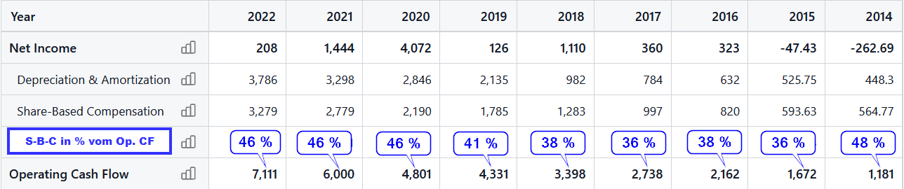 Stockinvestor Dezember 2, 2023 · bearbeitet Dezember 2, 2023 von Stockinvestor Was man bei Salesforce beachten sollte sind die Share-Based Compensation - also die Vergütung der Mitarbeiter in Aktien. Die betragen bei Salesforce zur Zeit ca. 46 % vom Operativen Cash Flow. Ich habe das mal für die vergangenen Jahre ausgerechnet: Quelle Diesen Beitrag teilen Link zum Beitrag