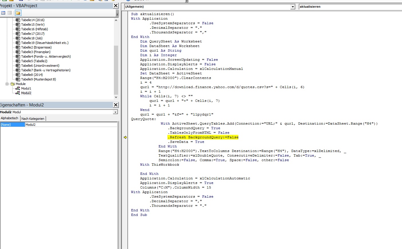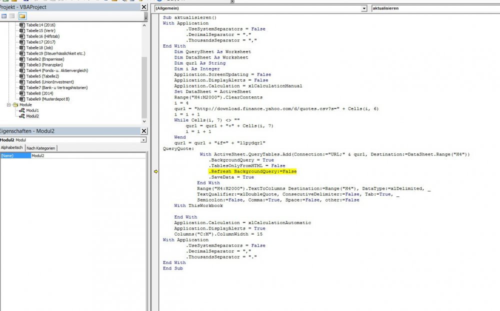 Borusse November 3, 2017 vor 2 Stunden schrieb Mittemeier: Doch gibt es... Habe jetzt meine Excel probehalber bei 10 Aktien auf https://www.alphavantage.co/ umgestellt --> funktioniert, aber deutlich aufwendiger zum Anlegen und nicht ganz so schön (z.b. immer automatischer abruf der 100 letzte Werte, pro Aktie 1 abruf notwendig (kein &), nur USD Kurse -> Umrechnung mit Wechselkurs, ...) aber im Prinzip kommt man an die Daten ran. Gerne Vorschläge, was es sonst noch gibt. Hallo, kannst Du vielleicht mal darlegen, wie genau Du das verbaut hast? Ich habe nicht so viel Ahnung von VBA Programmierung. Aber den "Debugger" aufrufen und den Link austauschen, würde ich noch hinbekommen. Hattest Du das auch ähnlich konstruiert oder funktionierte das bei Dir irgendwie anders? MfG Diesen Beitrag teilen Link zum Beitrag