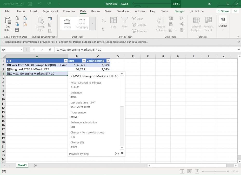 Aber wenn das dann mal verfügbar ist, funktioniert es auf den ersten Blick ganz gut. Man muss das Ticker-Symbol der Frankfurter Börse (z.B. VGWL) eingeben und auf "Stocks" klicken. Dann kann man über die Zelle auf verschiedene Daten zugreifen,=A2.Price beispielsweise fügt den aktuellen Kurs des Stock-Datentyps aus A2 ein. Die Kurse kommen von Xetra, andere Informationen wie Vortagesveränderung, 52-Wochen-Hoch/Tief etc. sind ebenfalls verfügbar.