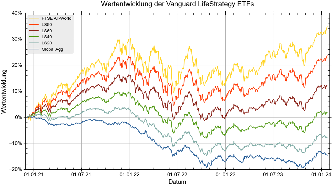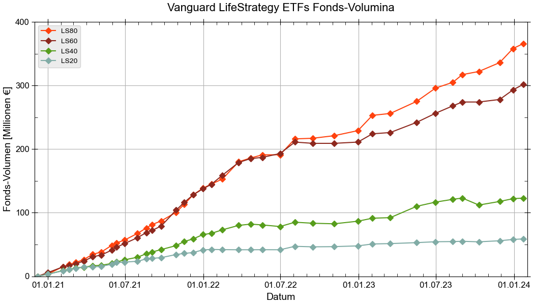 stagflation Januar 24, 2024 vor 2 Stunden von west263: vielleicht kommt ja bald ein frisches Update Ja, sehr gerne... Zuerst die Wertentwicklung in Euro: (Klicken für Vergrößerung, Datenquelle: XETRA Schlusskurse von http://www.xetra.com) Die Fondsgrößen: (Klicken für Vergrößerung, Datenquelle: https://www.morningstar.de) Mittlerweile beträgt das Fondsvolumen der 4 LifeStrategy ETFs 880 Mio. €. Die Milliarde kommt also in Reichweite... Diesen Beitrag teilen Link zum Beitrag