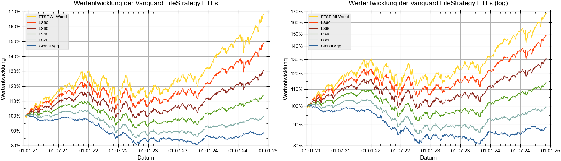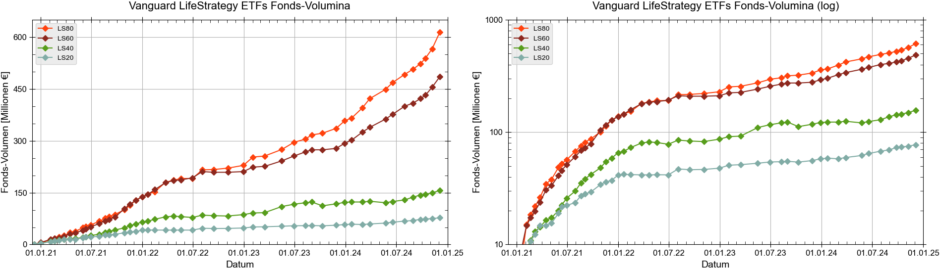 stagflation Dezember 6, 2024 · bearbeitet Dezember 6, 2024 von stagflation Am kommenden Sonntag ist der 4. Geburtstag der LifeStratgey ETFs. Schauen wir uns an, wie sie sich entwickelt haben: Zuerst die Wertentwicklung in Euro: (Klicken für Vergrößerung, Datenquelle: XETRA Schlusskurse von http://www.xetra.com) Aus heutiger Sicht sieht man drei Phasen. Im ersten Jahr sind die Aktien gestiegen und die Anleihen ungefähr gleich geblieben. Die nächsten beiden Jahre waren turbulent: Aktien haben sich seitwärts bewegt und Anleihen sind um 20% gefallen. Im letzten Jahr haben sich Anleihen leicht erholt (und sind jetzt nur noch 10% im Minus gegenüber dem Anfang) und Aktien sind um 30% gestiegen. Die fallenden Aktienkurse im Juni 2022 sind längst vergessen. Die Fondsgrößen: (Klicken für Vergrößerung, Datenquelle: https://www.morningstar.de) Das Volumen aller LifeStrategy ETFs beträgt 1,3 Mrd. Euro. Ich weiß nicht, wie Vanguard die Entwicklung ihrer LifeStrategy ETFs beurteilt? Ich vermute, dass sie mit der Entwicklung von LS80 und LS60 zufrieden sind. Mit der Entwicklung von LS20 und LS40 vermutlich weniger. Sie werden aber auch wissen, dass die Attraktivität von LS20 und LS40 steigen wird, wenn das Zinsniveau im Bereich von 8 Jahren wieder fallen wird. Diesen Beitrag teilen Link zum Beitrag