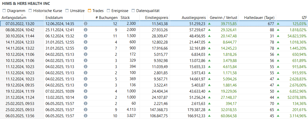 Lever-H 6. Mai An der Börse geschahen heute verrückte Dinge. Das kleine Unternehmen hims gehörte bzgl des USD-Handelsvolumens zu den Top5, knapp hinter Apple. Pre-market lag der Kurs von hims bei -9%. Während des offiziellen Handels stand er bis zum Abend knapp 30% höher. Bei einer weiterhin extrem hohen Short-Quote kann in den nächsten Tagen weiterhin Verrücktes passieren. Was ich @Ecke908090 vorhin schon vorab gesteckt hatte: —- Hatte vor ein paar Tagen mein persönliches Verkaufslimit auf 62,50 $ gesetzt. Meine Posi wäre dann 500k $ stark. Ich überlege nun aber, einen (Teil-)Verkauf bei um die 50 $ vorzunehmen - falls wir das in dieser Woche sehen. Die Zahlen von gestern Abend waren zwar gut, aber eben mit dem ein oder anderen "aber" versehen. Insgeheim hatte ich auf einen heftigeren Burner gehofft, insb bzgl des Ausblickes. —- Das Management betreibt bzgl des Ausblickes erneut Sandbagging. Q2Revenue erwarte ich höher als die angegebene Range zwischen 530-550 Mio USD. Auch das Jahres-Revenue erwarte ich über 2,4 Mrd USD. Die Aktie von hims begleitet mich nun 4 Jahre und mein Weg, sie aktiv zu traden als mein persönlicher Hebel (Lever-H), war bisher extrem erfolgreich. In den letzten Wochen habe ich nach zwischenzeitlichen Komplettverkäufen ca 270k USD in die Aktie investiert. Heute Abend habe ich mich dabei erwischt, wie ich alle paar Minuten den Kurs geprüft und diverse Stimmungsbilder eingeholt habe. Habe auch mal meine Frau nach Ihrer Meinung gefragt. Überraschenderweise riet sie nicht zum Verkauf, sondern empfahl, voll auf mein Gefühl zu hören. Rational bewerten lässt sich die Aktie bei dem wilden Treiben einiger Akteure an der Börse ohnehin nicht. Mein „Gefühl“ (Glaskugel) sagt mir, dass die Aktie sich vervielfachen wird. Das Management macht einen bärenstarken Job und die Pipeline verspricht Burner. Mein Gefühl ruft aber auch stark nach meinen persönlichen Regeln bzw. meiner Anlagestrategie einschließlich Risikomanagement. Kurz vor Börsenschluss handelte ich dann konsequent: Verkauf hims. Alle 8.000 Stücke zu 49.6 $. Selbstverständlich werde ich das Unternehmen weiter beobachten und bei einem Kursdrop unter 40$ einen Wiedereinstieg prüfen. Wenn der Kurs stattdessen nach oben weiter rennt, gratuliere ich den investiert gebliebenen. Im Stall habe ich noch andere aussichtsreiche Pferde, insbesondere NU und AMD. Letztere haben vorhin ordentliche q1-Zahlen veröffentlicht. Derweil bleibt die Welt verrückt: - der beginnende Krieg zwischen Indien und Pakistan macht mir Sorgen - Trump hat etwas großes angekündigt. Was auch immer es sein wird: hoffentlich dient es der Sicherung von Frieden zwischen den Großmächten und fördert den Handel.. Diesen Beitrag teilen Link zum Beitrag