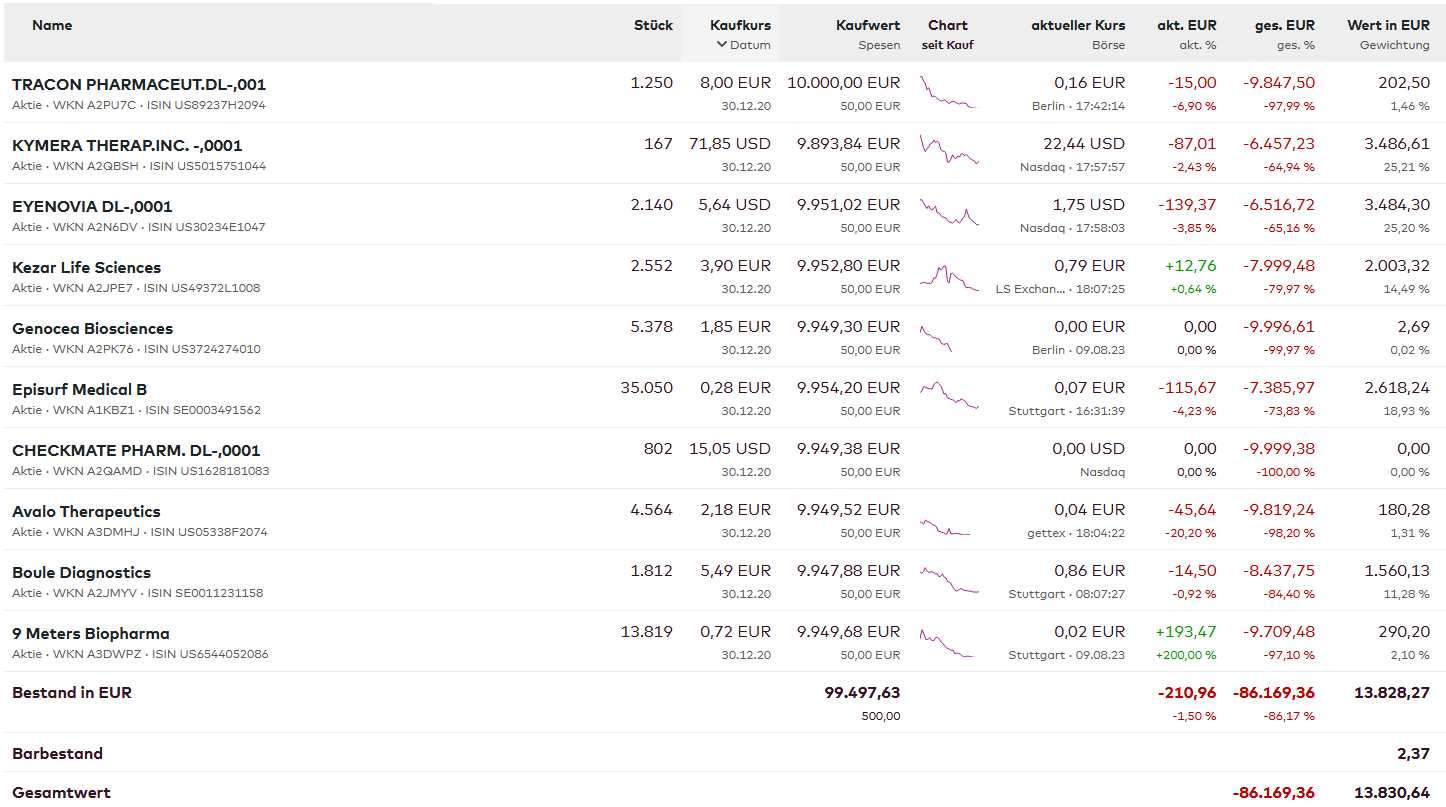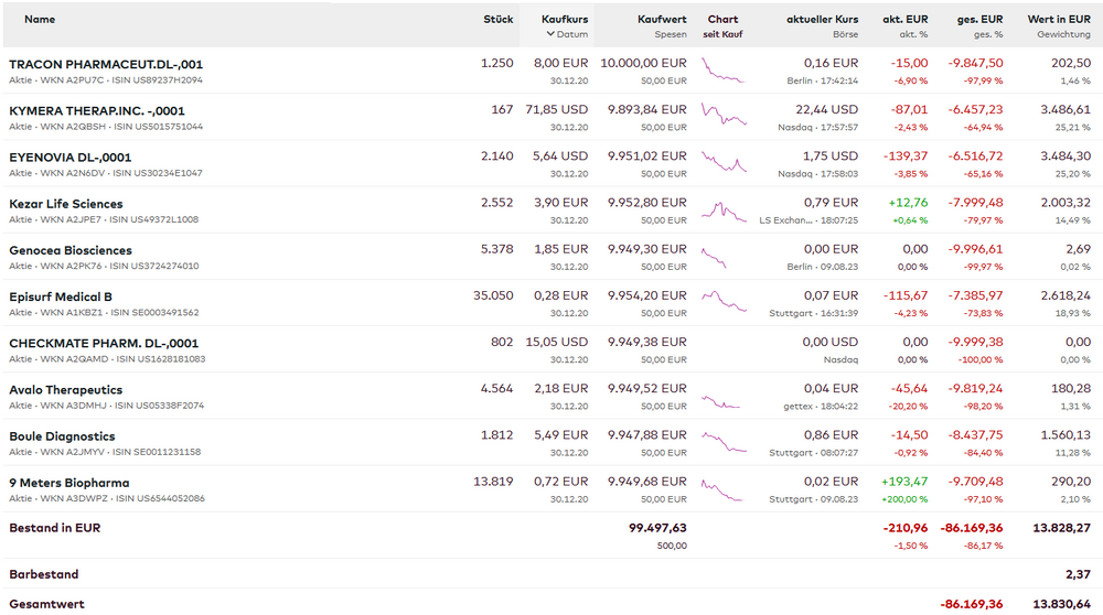 Goldmarie92 August 14, 2022 Hallo, ja, ich habe das Biotech-Depot tatsächlich in echt. Unter uns gesagt, ziemlich desaströs. Eine Firma ist bereits pleite, eine wurde von Regeneron Pharma (Ende Mai 2022) übernommen. 10,5 USD - ich habe Regeneron Aktien dafür gekauft, für 59 Checkmate hab ich 1 Regeneron Pharma in den Bestand übernommen. Da ich ursprünglich 2000€ pro Wert eingesetzt hatte. und Checkmate schon fast 30% im Minus war sind es 3 Regeneron Aktien geworden. Also sind noch 9 Firmen im Rennen keine Panik, dieses Biotechdepot nur ein Teil der Anlage. Der Rest läuft konservativer. Sparplan auf einen ETF und 2 Aktien (Fresenius, Hannover Rück). In Summe hab ich im Bestand: 1 ETF 15 Einzelaktien (dank einiger Forenteilnehmer eine konservativere Angelegenheit, ob besser als ETF wird die Zeit zeigen) 4 Reits Verteilung: ca. 20% Reits, 55% Aktien und 25% ETF Ziel: ETF auf 50% ausbauen, dafür nutze ich die Dividenden der Aktien und der Reits, bzw. ist der Sparplan auf ETF monatlich übergewichtet (im Vgl. zu den 2 Aktiensparplänen) Ein paar Jahre wird es noch dauern, bis ich 50% Depotanteil ETF haben werden. 1 Biotechdepot: Das behalte ich einfach., ca. ~30% aktuell im Minus Viele Grüße Goldmarie92 Diesen Beitrag teilen Link zum Beitrag