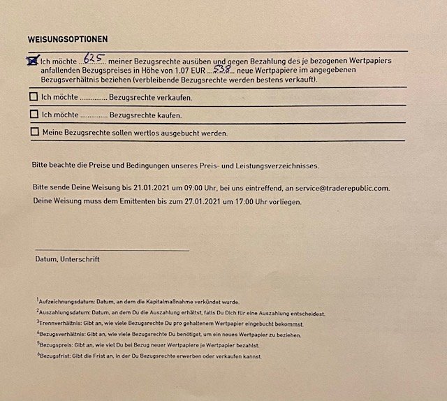 Entscheidest Du Dich für die Ausübung Deiner Bezugsrechte, trage bitte die korrekte Anzahl an auszuübenden Bezugsrechten und zu beziehenden Aktien in das Weisungsformular, das Du in Deinem Profil in der Trade Republic App findest, ein und kreuze die gewünschte Option an. Bitte sende uns das Weisungsformular bis zum 21.01.2021 zu.