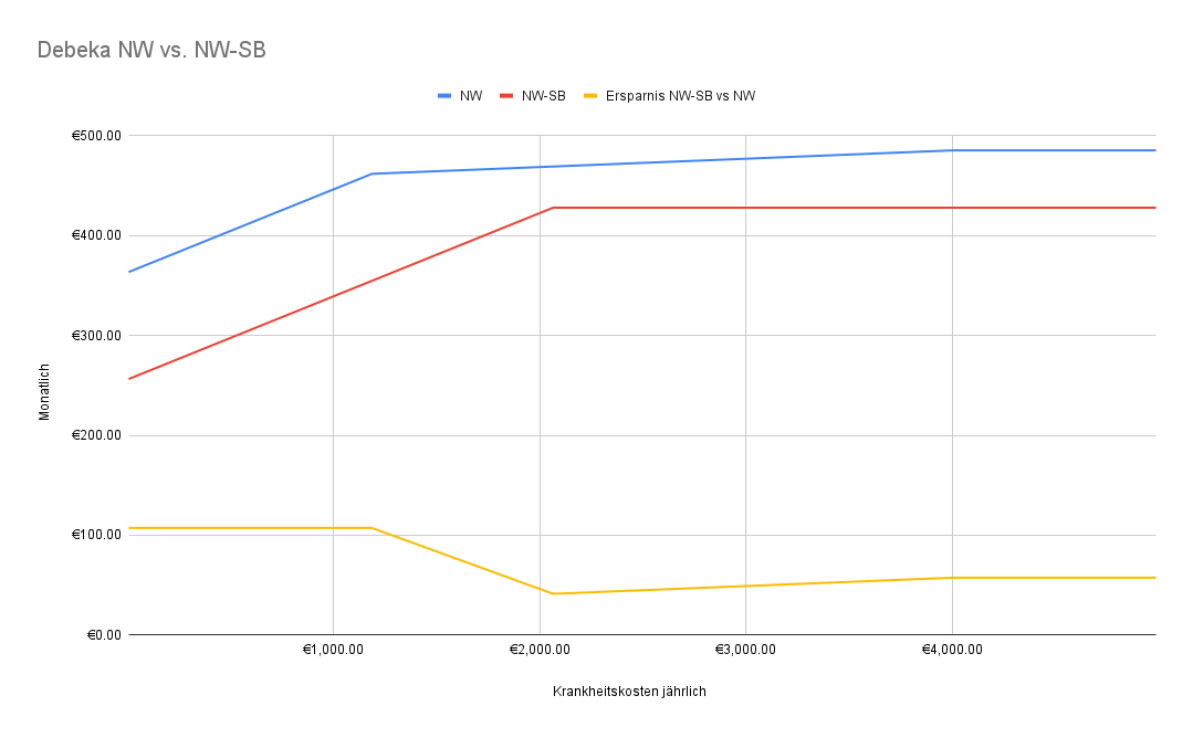 Ohne Krankheitskosten ist der NW ca. 400€/Jahr (wenn es keine BRE gibt) oder 240€/Jahr (wenn es eine BRE gibt) teurer als der NW-SB.