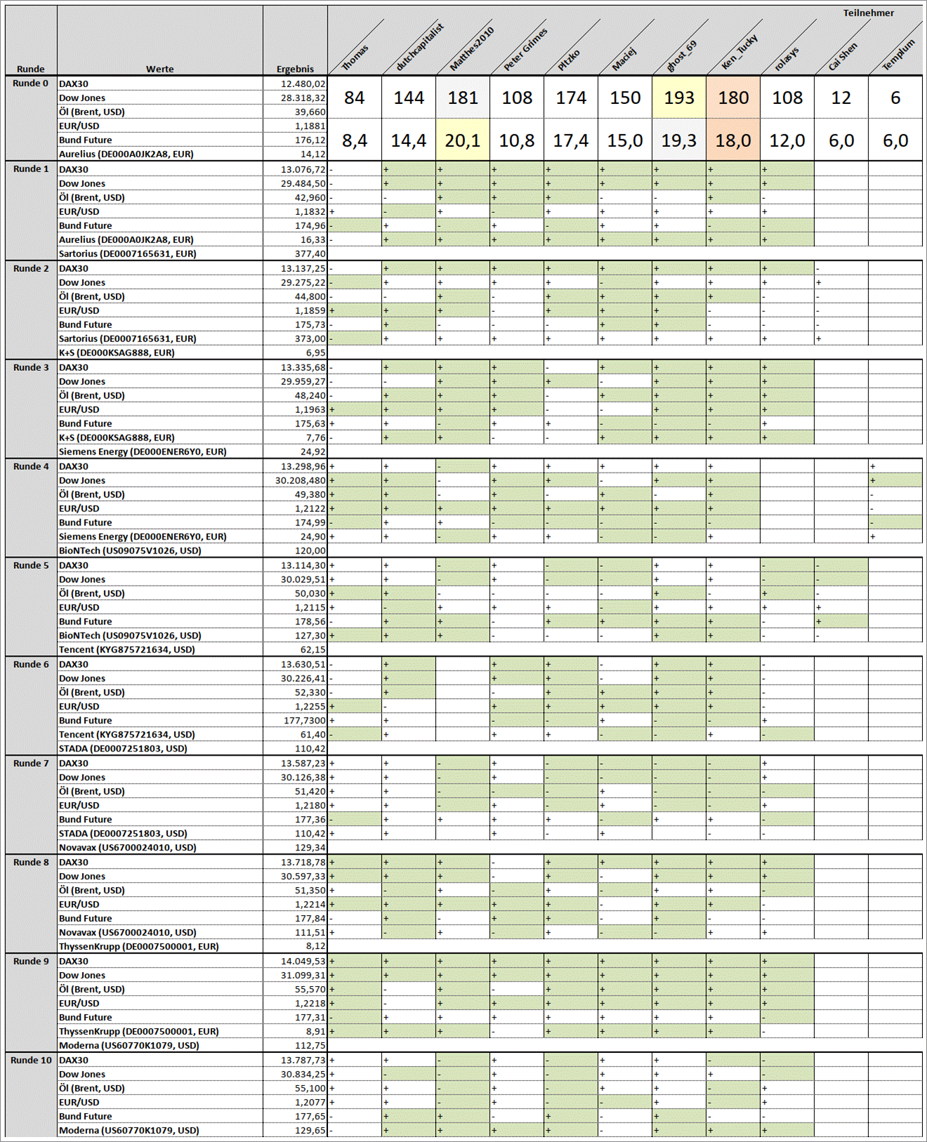 Thomas Januar 15, 2021 Hallo zusammen, eine weitere Börsenwettrunde beginnt. Viel Spaß beim Wetten. Tippabgabe bis Montag 17:00 Uhr --> 11. Runde von 11 Runden. Neue Startwerte und Veränderung aus der letzten Runde: 1. DAX30: 13787,73 (-) 2. Dow Jones: 30834,25 (-) 3. Öl (Brent, USD): 55,1 (-) 4. EUR/USD: 1,2077 (-) 5. Bund Future: 177,65 (+) 6. Moderna (US60770K1079, USD): 129,65 (+) 6. (Neu) AstraZeneca (GB0009895292, GBP): 7592 Informationen: Erst Tippabgabe! Danach können weitere Beiträge verfasst werden. Anders herum wird disqualifiziert! Die ersten 5 Werte stehen während der ganzen Tippsaison fest. Der 6. Wert wechselt von Runde zu Runde. Vorschläge für einen 6. Wert werden jederzeit entgegengenommen. Es dürfen jederzeit auch neue Spieler einsteigen und sich am laufenden Spiel beteiligen. Regeln:https://www.wertpapier-forum.de/topic/368-regeln-und-informationen-für-die-börsenwette/ Fragen:https://www.wertpapier-forum.de/topic/1420-fragen-zur-börsenwette-hier-rein/ Bitte die Tipps im vorgegebenen Format abgeben! So sieht der richtige Code als Beispiel aus: [hide ] (hier das Leerzeichen noch entfernen vor "]") 1. + 2. - 3. - 4. + 5. + 6. - [/hide] Mein Tipp: Versteckter Inhalt Du kannst den versteckten Inhalt sehen, sobald du auf dieses Thema antwortest. Geht doch! Geht doch, Leute! Mal wieder Volltreffer. Glückwunsch an die, welche meinem Rat folgen und das Gegenteil tippen. Hoffe, dass es die kommende Woche auch wieder so gut läuft. Diesen Beitrag teilen Link zum Beitrag