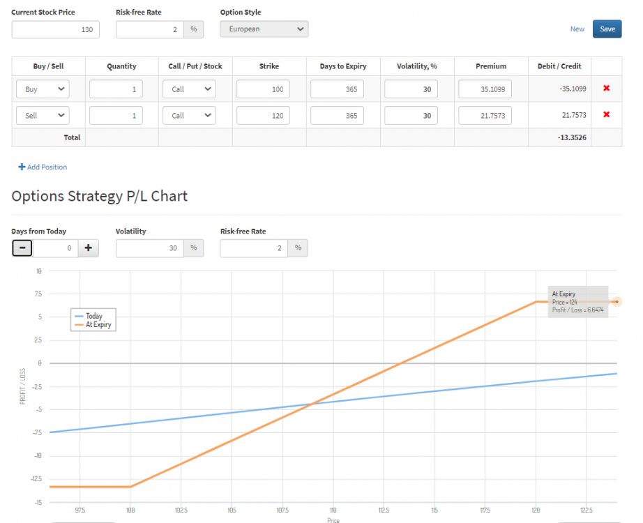 oktavian Februar 5, 2021 · bearbeitet Februar 5, 2021 von oktavian Ab 120 bei Verfall hast du den maximalen Gewinn von 20. Wenn der Kurs weiter steigt, ist der Verlust durch den short call gleich dem extra Gewinn durch den long call. Davon musst du deine Optionsprämien abziehen: 20-35,1099+21,7573=6,6474 (minus Kommisionen) Gleichgewichtspreis=35,1099-21,7573+100=113,3526 (plus Kommisionen) Wenn der Kurs bei Verfall unter 113,3526 liegt, machst du Verlust. Bei einem Kurs von 100 bei Verfall ist der maximale Verlust von -35,1099+21,7573=-13,3526 (minus Kommisionen) erreicht. Beide Optionen verfallen wertlos. Diesen Beitrag teilen Link zum Beitrag