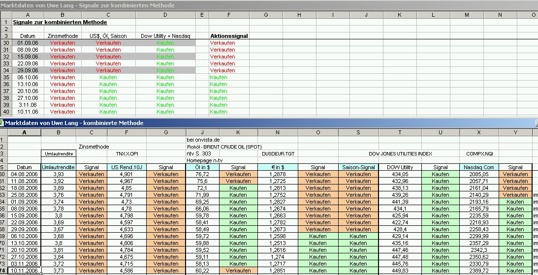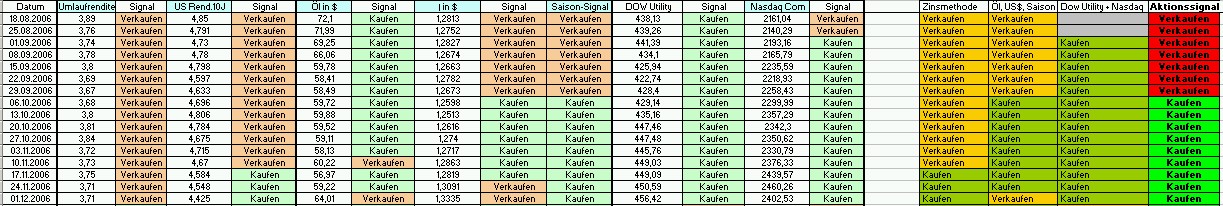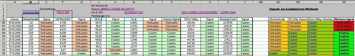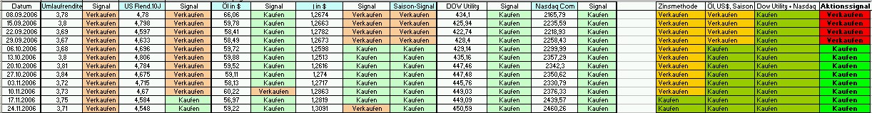 Onassis November 17, 2006 Aktuelle news: Die Tabelle wurde von unserem Mitglied ralf2209 überarbeitet. Das bedeutet, das nun alle Signale in einer Zeile angezeigt werden. Die Signale der einzelnen Methoden und das AKTIONS-Signal. Desweiteren hat er Hyperlinks eingefügt, damit die Werte schneller gefunden und eingetragen werden können. So sieht die aktuelle Tabelle aus: Für diese äußerst hilfreichen Veränderungen ein vielfaches Dankeschön an Ralf2209 Desweiteren ist folgendes diese Woche geschehen: 1. Die US-Rendite ist gefallen und somit zeigt das Zinssignal ein KAUFEN an. 2. Ist der Ölpreis wieder gefallen. Die US$/Öl/Saison Methode war sowieso auf KAUFEN, nun sind aber alle 3 teilnehmenden Faktoren auf Kaufen geschaltet. Somit sind nun zum ersten Mal alle drei Hauptsignal auf "BUY" geschaltet. Das sieht sehr gut aus! Onassis Diesen Beitrag teilen Link zum Beitrag