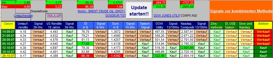Onassis Oktober 26, 2007 · bearbeitet Oktober 26, 2007 von Onassis Und hier die Übersicht: Das Hauptsignal steht weiterhin auf KAUFEN - die long Position bleibt bestehen. Die Zinsen sinken weiter, Öl und EUR/USD$ sind so teuer wie nie und die Börsenkurse ziehen wieder an. Abwarten und Johanniskraut schlucken, der trade zieht sich noch eine Weile Gewinne kann man an der Börse nun mal nicht auf die Schnelle erzwingen. Onassis PS: Die Tabelle hat beim aktualisieren ein Problem mit der US-Rendite 10-Jahre. Die Website hat sich wohl verändert. Deshalb nicht wundern, wenn jemand eine Fehlermeldung bekommt. ... und der Rest: Die Newsletter mit der Tabelle wurde soeben versendet. Wenn ihr noch nicht in den Verteiler eingetragen seid, könnte ihr es hier nachholen: https://www.wertpapier-forum.de/index.php?showtopic=13468 Möchtet ihr nur die Tabelle downloaden, klickt ihr hier: https://www.wertpapier-forum.de/index.php?showtopic=8567 Onassis Diesen Beitrag teilen Link zum Beitrag