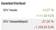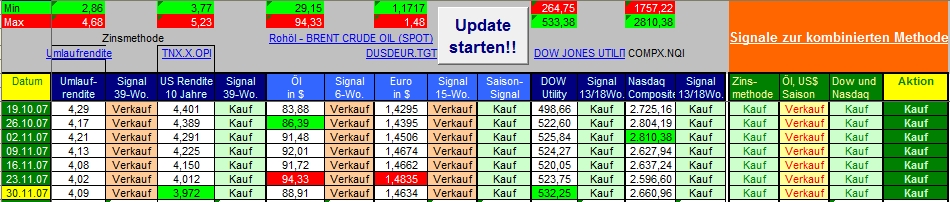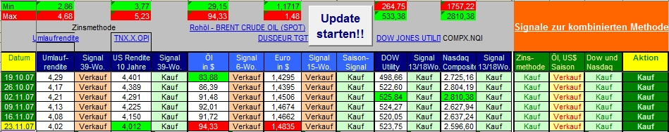 Onassis November 30, 2007 · bearbeitet November 30, 2007 von Onassis Über 400 Punkte Gewinn in den letzten drei Tagen. Wer da nicht investiert war, hat einen Großteil der Aufwärtsbewegung möglicherweise verpasst. Da aber alle an ihren Positionen festgehalten haben (hoffe ich doch mal ) waren alle komplett mit dabei. Öl und EUR sind sehr stark gefallen, die 10-jährige US-Rendite hat einen aktuellen Tiefststand, Dow Utilities ist auf einem neuen Höchststand. Es sieht alles sehr gut aus Bemerkung zur Tabelle: Die Website von tradesignal ist diese Woche komplett neu aufgebaut worden. Deshalb funktioniert die Abfrage beim Öl nicht. Ich habe den Wert von Hand eingetragen und werde "sali" kontaktieren. Hier die Signalübersicht: Zum Depot: Die DAB Bank stellt ihren Internetauftritt um. Deshalb kann ich momentan keinen Kontostand veröffentlichen - aber er hat sich auf jeden Fall verbessert Onassis Diesen Beitrag teilen Link zum Beitrag