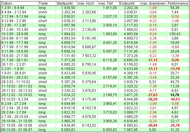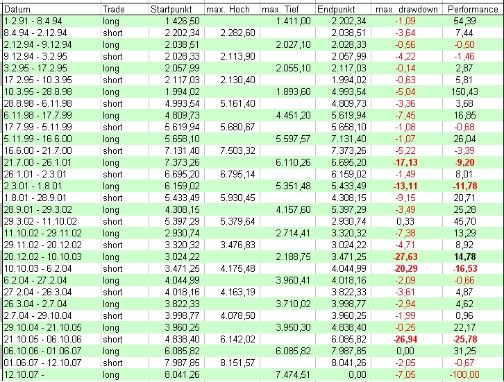 Onassis November 24, 2007 Aber wenn ich das richtig sehe hat das System die letzten vier Jahre (bzw. fünf Jahre bei einem Hebel von 3) keinen Gewinn erwirtschaftet (jeweils voll long oder short investiert).Buy and Hold jedoch mehr als 100% (bzw. ca. 350% bei einem Hebel von 3). Wenn man nur die long trades eingeht, so wie es "normalerweise" auch gedacht ist, hat das System sehr wohl Gewinn erwirtschaften können. Und dann mit einem Hebel von 3 einiges mehr al s 100% Wir haben schon sehr oft hin- und hergerechnet, ob man short einsteigen soll, bei einem short Signal. Das Ergebnis war, das es besser ist, bei einem short Signal das Geld auf ein Tagesgeldkonto zu verfrachten und es erst bei einem long-Signal wieder in die Böre zu investieren. Hast Du bei den max. drawdown-Werten eigentlich die Tiefstwerte des Tages oder nur die Tagesschlusskurse genommen?Hast Du noch die Daten für die Shortposition nach dem 1.6.2007? Für den maximalen drawdown wurden natürlich die Tageshoch bzw. Tagestiefstwerte verwendet. Der Schlusskurs wäre nicht aussagekräftig! Und die Daten für den letzten short trade habe ich soeben nachgetragen: Onassis Diesen Beitrag teilen Link zum Beitrag