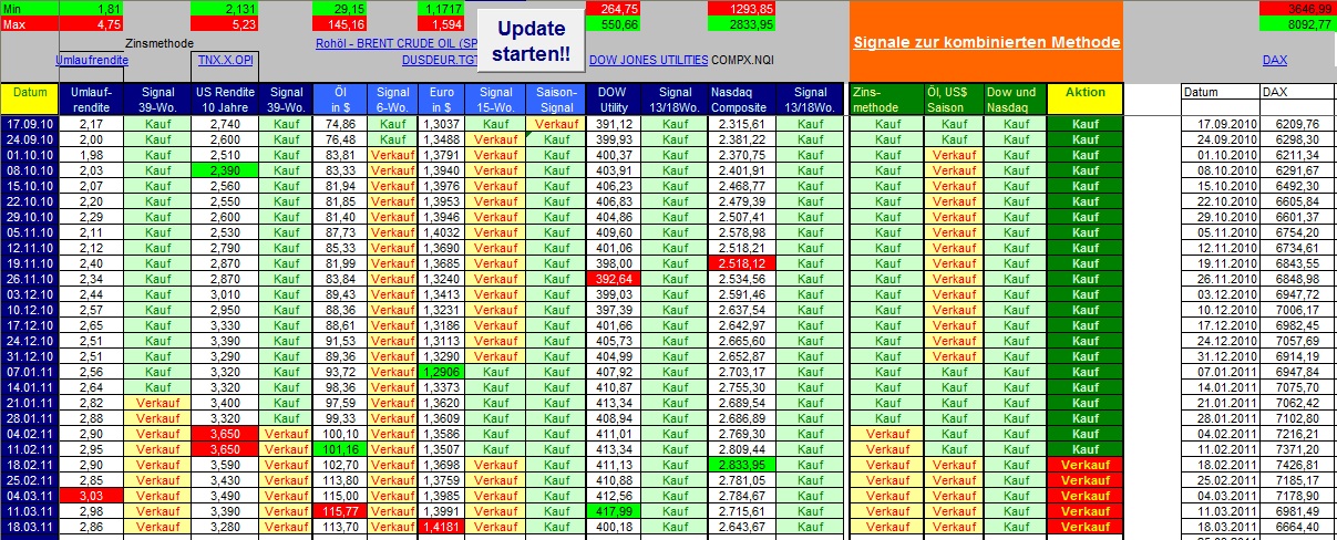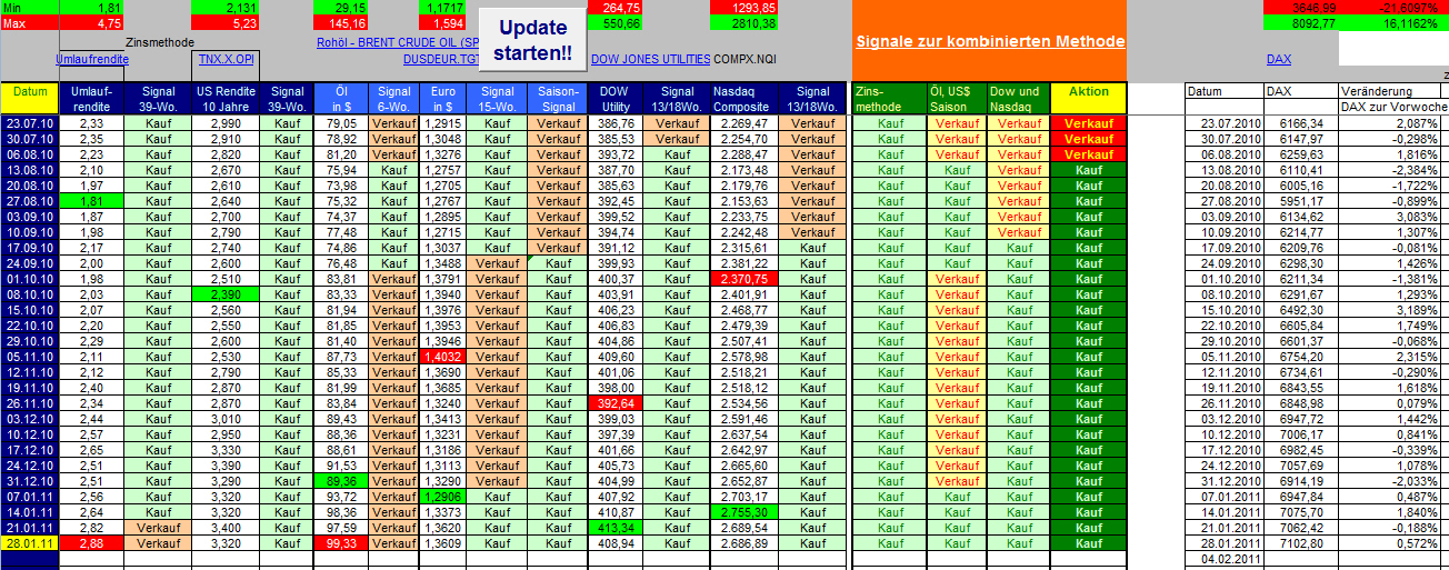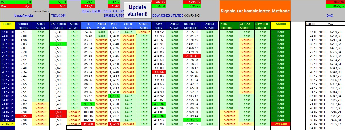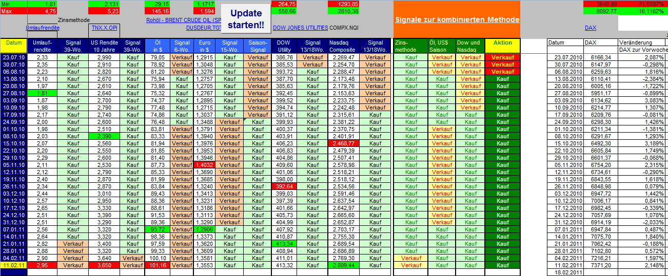 Sali Februar 27, 2011 Hallo Sali, mir ist aufgefallen, dass der USD-Kurs letzte Woche knapp daneben war, Schlusskurs war 1,3698. Diese minimale Abweichung ist deshalb bedeutend, da das System somit bereits letzte Woche auf "VERKAUF" schaltete. Grüsse hotshot Die Daten des Kurses werden von dieser Seite hier geholt. http://www.onvista.de/devisen/snapshot.html?ID_CURRENCY_FROM=EUR&ID_CURRENCY_TO=USD Der Schlußkurs erscheint dort nicht. Ich hab Deinen Schlußkurs in die Exceldatei übernommen. Diesen Beitrag teilen Link zum Beitrag