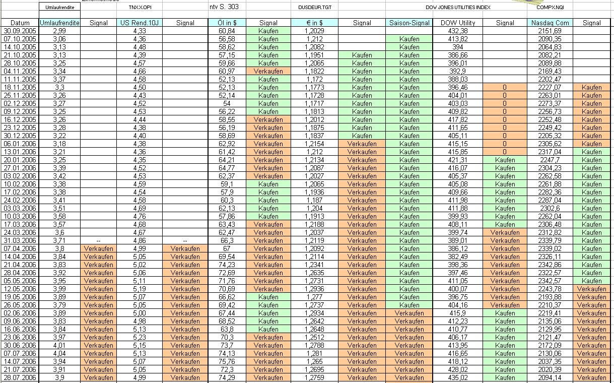 Onassis Juli 30, 2006 Bisher sind die Aktienmärkte in der Tat stets sklavisch den Zinsen gefolgt. Aktuell markieren aber Umlaufrendite und 30-Year-T-Bond leicht unter den letzten Hochs, wenn sich da eine leichte Tendenz nach unten entwickelt, könnte sich das sehr positiv auswirken. Der DJ Utility Average ist auch ein interessanter "Indikator", er befindet sich ja zur Zeit in einem starken Anstieg seit Monaten, was auch ein sehr postivies Zeichen ist.Negativ zu werten ist der hohe Goldpreis zur Zeit. Der befindet sich ja nach einem zwischenzeitlichen Tief wieder auf Kurs auf die Höchststände von April und Mai. Nach meiner Einschätzung sieht es eher postitiv aus, es bleibt abzuwarten, wie sich die beiden wichtigsten Indikatoren Umlaufrendite und 30-Year-T-Bond weiterhin entwickeln. Außer dem Dow Jones Utility sieht eigentlich alles bearisch aus im Moment. Hier die Tabelle dazu: Onassis Diesen Beitrag teilen Link zum Beitrag