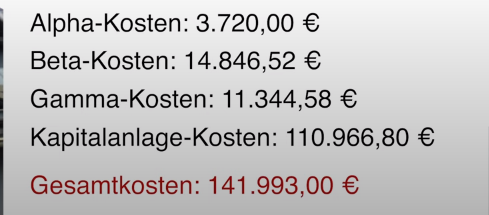 Der große Mehrwert der Videos ist aber die Aufschlüsselung der Alpha, Beta und Gamma Kosten. Das sind die Zahlen worauf man schauen sollte und auch Vergleichen.