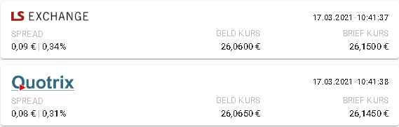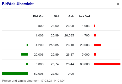 Der Spread beträgt also 0,31%. Bei einem Kaufvolumen von 10.000 € oder mehr würde ich den LS bei Xetra handeln, weil es dort (in Deutschland) die größten Umsätze gibt. Und ich würde einen Limit-Auftrag aufgeben und das Limit in die Mitte zwischen Ask- und Bid-Kurs setzen, also in diesem Fall auf 26,04 €. Klappt fast immer (manchmal sofort, manchmal nach ein paar Stunden) - und ich bekomme einen etwas besseren Kurs, als wenn ich den Ordertyp "bestens" wähle.