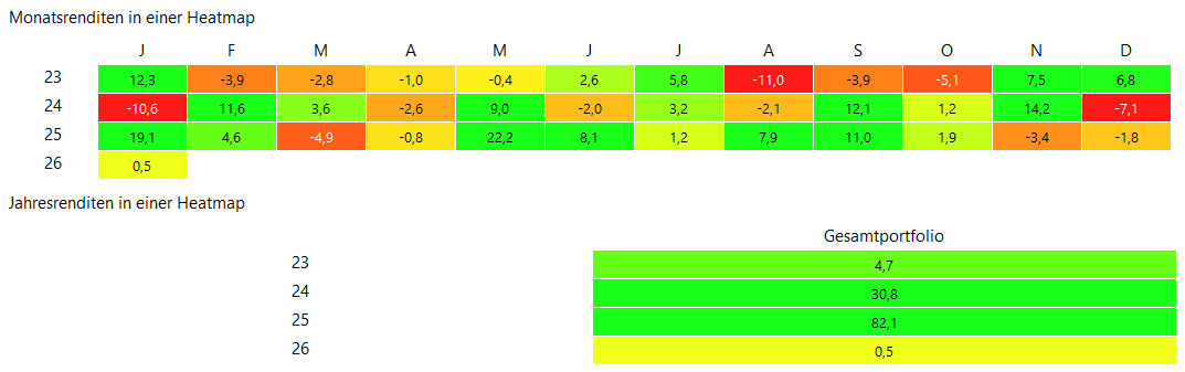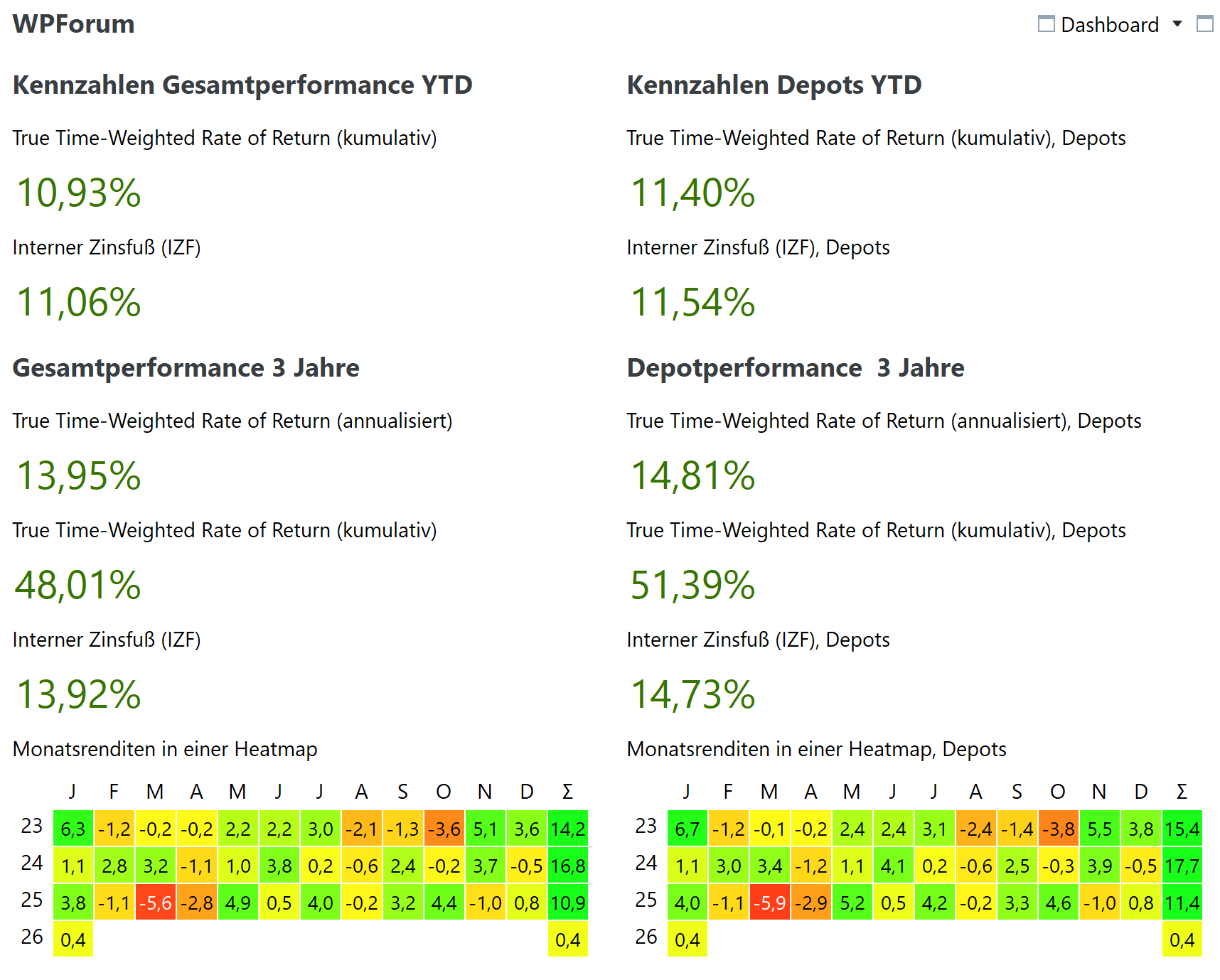 Fetz vor 20 Stunden Hmmmm, so viele Foristen - und nur 15 posten die 3-Jahres-Ergebnisse hier? Nur Mut, alle lernen hier von allen, und das gilt auch für inzwischen staubtrockene Investoren wie mich. Tracken denn so wenige Ihre echte Performance (und begnügen sich mit den kumulierten Ergebnissen der Bankauszüge? Mag ich kaum glauben. Im 2025-Thread sieht man sehr schön, das dieses Jahr vom üblichen MSCI-WORLD-THEMA abweichende Allokationen ( Mag7/Gold/EM/EU) die Nase vorn hatten. Und auch BIP! (Herzlichen Glückwunsch nach STU!) Das wäre hier auch lehrreich (Obwohl: Abschätzen kann man es auch so). Mal sehen. Ab nächstem Jahr könnten wir auch mal 5-J-Ergebnisse anzeigen. (So lange Übersichten wie bei @Ramstein oder auch @dev sind natürlich noch schöner) Diesen Beitrag teilen Link zum Beitrag