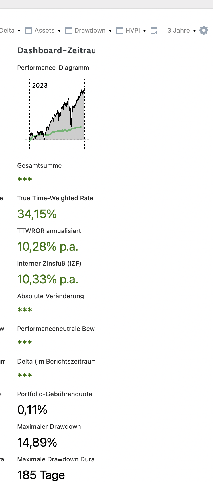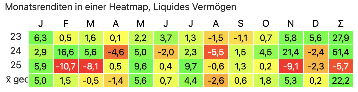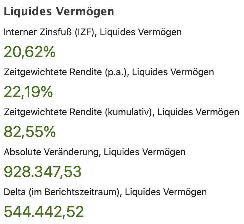 chirlu 1. Januar Am 3.1.2025 um 04:53 von chirlu: Für das neue Jahr 2025 bin ich gerade bei 297% p.a. Das darf natürlich gern so bleiben bis Jahresende. Wenig überraschend hat sich die Entwicklung so nicht ganz fortgesetzt. Hier die letzten drei Jahre, Gesamtvermögen außer der Anwartschaft in der gesetzlichen Rentenversicherung: Diesen Beitrag teilen Link zum Beitrag