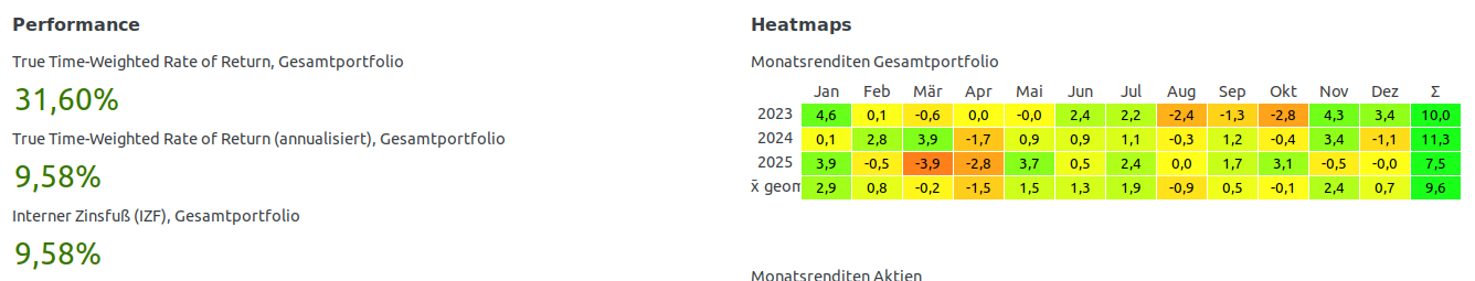 Holgerli 3. Januar · bearbeitet 3. Januar von Holgerli Kann mich nicht beklagen: Gesamt-Portfolio inkl, Aktien, ETFs, Anleihen-ETFs, Sparprodukte, Bankanteile und TG: Nach Produkten (Aktien & ETFs sind in der Rubrik "Aktien"): Nur die Einzel-Aktie, Aktien-ETFs und Anleihen-ETFs,: Nach Produkten: 2025 war zwar etwas schwächer wurde aber auf Dreijahressicht von den Vorjahren getragen. Diesen Beitrag teilen Link zum Beitrag