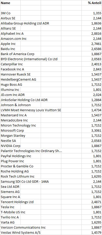 Kezboard April 5, 2021 Warum (ich meine, dass) du den MSCI Worldwide nicht schlagen wirst: 1. Übergewichtung Euroland ggü. Benchmark. Europa steht nach der Coronaepidemie gefühlt am schlechtesten da. In China geht es schon seit letztem Jahr, in USA seit diesem Jahr aufwärts. Das wird langfristig Marktanteile kosten. 2. Keine Schwellenländer Europa, kein Afrika. Mag zwar prozentual nicht viel ausmachen, sollte aber ein Wachstumstreiber sein. 3. Untergewichtung Asien und Asien ex Tigerstaaten. Auch hier sollte zukünftig mehr Wachstum möglich sein. Dafür wurde Lateinamerika übergewichtet. Gleicht sich das aus? Bei der Wette Asien oder Lateinamerika würde ich eher zu Asien tendieren. Zu den Einzeltiteln: Mit am stärksten gewichtet sind Microsoft, Facebook, Alphabet, Apple, Baidu, Amazon, Tencent und Samsung. Das sind alles Werte, die schon sehr weit gelaufen sind in den letzten Jahren. Wo soll da das Potential für weiteres Wachstum liegen? Wenn Tech nicht mehr gefragt sein sollte, geht dein Depot hier unter. Einige Titel kenne ich auch gar nicht: Illumina, Rock Tech, Twilio. Aber vielleicht weißt du da mehr und es ist ja legitim, aussichtsreiche Nebenwerte ins Depot zu holen. Dazu kommen einige Titel eher fragwürdiger Natur: Airbus, Allianz, Hugo Boss ... Turnaroundkandidaten? Als durchaus solide würde ich Aktien wie 3M, Caterpillar, J&J, LVMH, Mastercard, Nestlé und P&G ansehen. Da kann man nicht viel falsch machen. Zu dem Rest habe ich keine oder wenig Meinung. T-Mobile US hat wohl viel richtig gemacht in den letzten Jahren, aber wie es da weitergehen soll? Ist der hohe Tesla-Kurs gerechtfertigt oder holen die klassischen Autobauer auf? Von Banken und Versicherungen halte ich persönlich nicht viel - aber ich muss ja nicht Recht haben. Fazit: sehr hoher Fokus auf Techtitel. Kann gutgehen, muss es aber nicht. Insgesamt fehlt mir der "rote Faden" und der Fokus auf ein bestimmtes Thema (Value/Growth, Dividenden, Qualität, ...). Da sieht es teilweise recht zusammengewürfelt aus. Aber vielleicht kannst du hier selber etwas Klarheit ins Spiel bringen, indem du kurz deine Beweggründe für die ein oder andere Aktie aufführst. Ich hoffe, du nimmst es als konstruktive Kritik an und wünsche dir viel Erfolg mit deinem Depot! Diesen Beitrag teilen Link zum Beitrag