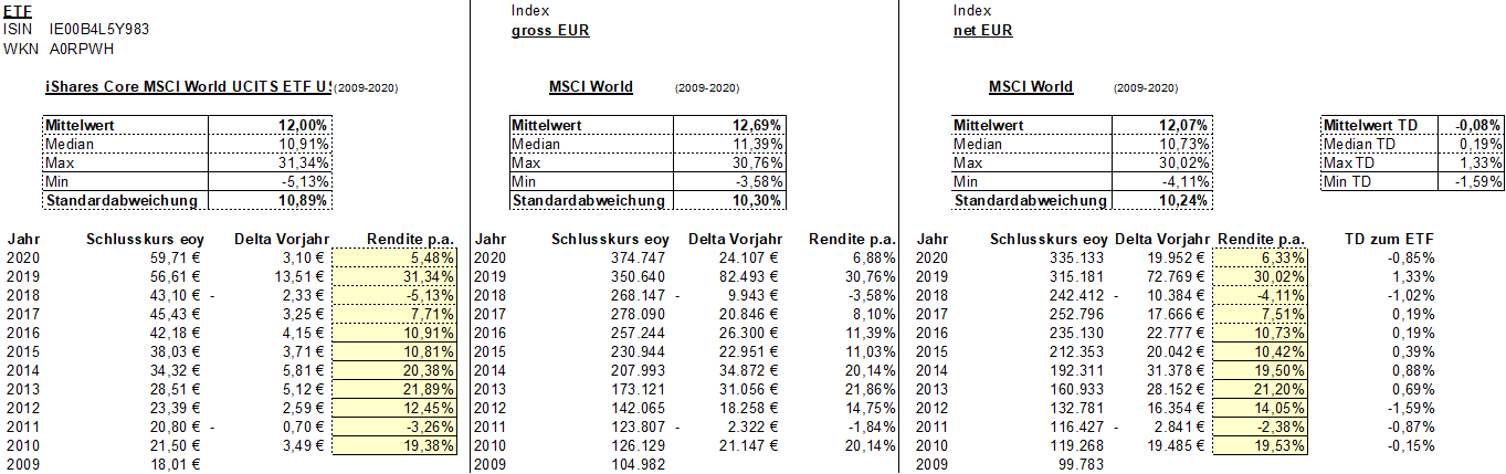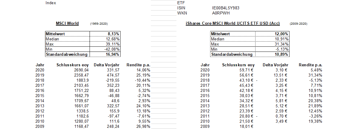 ich habe die historische Entwicklung des MSCI World-Index von 1969-2020 dem iShares Core-ETF (IE00B4L5Y983) von 2009-2020 gegenübergestellt, Auszug siehe unten im Screenshot.