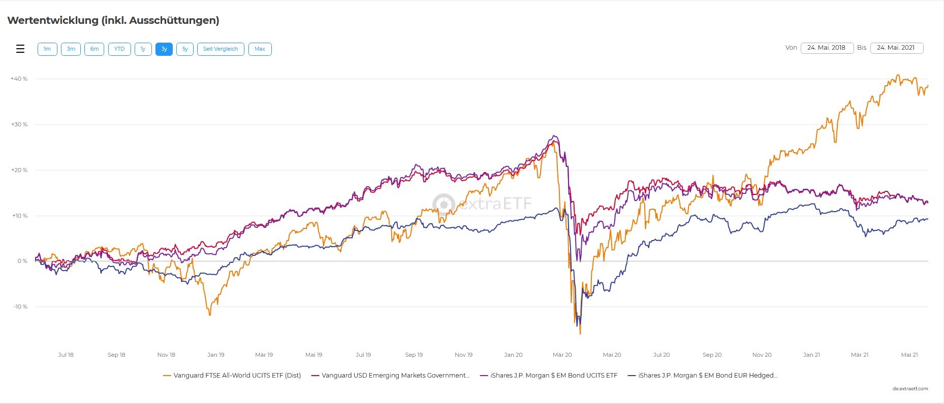 supertobs Mai 26, 2021 vor 45 Minuten von Sonjaf86: Würdest du rückblickend anstatt den Euro Währungsgesicherten Xtracker gleich den Ishare USD EM Bond nehmen? Das kommt auf den Anlagezeithorizont und den möglichen kurzfristigen Geldbedarf an. USD-EUR schwankt so 11%. Dann will man so Positionen ja auch nicht verkaufen. Also rückblickend EUR-hedged weil ich nicht so wusste wie es damals weiter geht. Aus heutiger Sicht habe ich 100 k in EUR-hedged und zusätzliche Mittel in EM-Staat hart (frisches Geld) wird also sehr sehr langfristig angelegt. Dann gibt es die "Reverse-To-Mean"-Theorie bei den Währungen, also alles gleicht sich wieder aus. Dann wäre blöd dauernd mehrere % Hedging-Kosten zu tragen von denen man fast nichts hat. Damals gab es halt auch noch mehr Anleihen in Original-EUR oder zumindest die Annahme, sprich: Hering auf den Rest. Heute sieht man das fast 100% der Anleihen in USD notiert sind. Ergo: es ist eine Einzelfall-Entscheidung. Wenn man partout es nicht entscheiden kann, kann man ja auch Hälfte/Hälfte machen. Massive Fehler macht man nicht, sind Nuancen. Diesen Beitrag teilen Link zum Beitrag