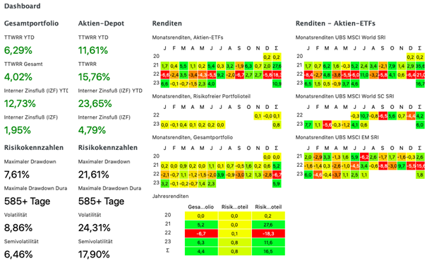 brln_sri Juli 4, 2023 Update #23 | Stand: 30. Juni 2023 Das ersten sechs Monate des Jahres 2023 sind vorbei und damit ist es Zeit für eine etwas ausführlichere Halbjahresbilanz. Asset-Allokation Gestartet in das neue Jahr bin ich Anfang Januar 2023 mit einer Aktienquote von 47,7%. Sechs Monate später liegt sie bei 57,4% und damit 9,7 Prozentpunkte höher als zu Jahresbeginn. Ende Mai stand ich bei 55,8% – also +3,1 Prozentpunkte im Vergleich zu Ende April. Da ich die monatliche Sparrate in der Zeit nicht erhöht habe, ist der vergleichsweise schnelle Zuwachs maßgeblich auf die steigenden Kurse zurückzuführen. Innerhalb der Aktien-ETFs hat der MSCI World SRI weiter den größten Anteil mit 61,81% und der MSCI World SC SRI den kleinsten Anteil mit 15,09%. Der MSCI EM SRI ist zurzeit mit 23,10% am weitesten von der Zielallokation entfernt. Das Regionenverhältnis World zu EM liegt entsprechend bei 76,9% zu 23,1%. Performance Im Mai 2023 ging es für das Portfolio wieder nach oben. Die Aktien-ETFs rentierten insgesamt mit 2,3%, darunter der MSCI World SRI mit 3,7% am stärkten. Die Gesamtperformance im Mai lag bei 1,4%. Die Kurse der Bundesanleihen legten um 0,2% zu. Im Juni 2023 folgten dann weitere Kursgewinne. In der Vergangenheit kam es nicht so häufig vor, dass zwei Monate hintereinander im Plus standen. Der MSCI World SRI legte im Juni mit 4,6% am stärksten zu, gefolgt vom MSCI World SC SRI mit 4,1% und dem MSCI EM SRI mit 2,5%. Die Gesamtperformance im Juni lag bei 2,3%. Auf das erste Halbjahr gesehen liegt die Perfomance des Gesamtportfolios bei 5,9%. Ich denke, dass ich damit ganz zufrieden sein kann. Die Aktien-ETFs rentierten mit 10,9% sogar zweistellig, der risikoarme Portfolioteil mit 0,8%. Hier noch ein abschließender Blick auf das Dashboard: Ausblick Da ich das Ziel von 60% Aktienquote noch nicht ganz erreicht habe, geht die monatliche Sparrate weiter zu 100% in die Aktien-EFTs. Anfang August steht dann noch die zweite Ausschüttungsrunde 2023 für den MSCI World SRI ETF und den MSCI EM SRI ETF an. Die Ausschüttungen werden natürlich wieder reinvestiert. Außerdem hat die DKB angekündigt, ab 1.8. für ein halbes Jahr das Tagesgeld mit 3,5% p.a. zu verzinsen. Da muss ich mir die Rendite der Staatsanleihen noch einmal genau angucken und ausrechnen, ob nicht doch ein vorzeitiger Verkauf sinnvoller wäre. Diesen Beitrag teilen Link zum Beitrag