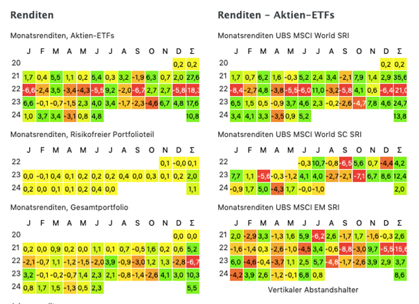 brln_sri Juli 4, 2024 · bearbeitet Juli 4, 2024 von brln_sri Update #28 | Stand: 30. Juni 2024 Einige werden es vielleicht gemerkt haben, es kam jetzt längere Zeit kein Update. Das liegt daran, dass sich bei meinen Finanzen einige grundlegende Dinge getan haben und ich erst einmal für Ordnung sorgen muss. Auf die Details will ich in einem späteren Post eingehen. Für den Moment würde ich gerne eine Halbjahresbilanz für die Aktien-ETFs ziehen. In den vergangenen Monaten konnte ich die Zielverteilung auf Ebene der Aktien-ETFs gut einhalten. Aktuell besteht das Depot aus 62,5% MSCI World SRI, 14,1% MSCI World SC SRI und 23,4% MSCI EM SRI. Die leichten Verschiebungen liegen natürlich an der unterschiedlichen Performance. Der MSCI World SRI hat sich seit Beginn des Jahres mit 13,8% sehr positiv entwickelt; ebenso der MSCI EM SRI mit 8,6%, wobei ein Großteil davon auf den Kurssprung im Juni zurückzuführen ist. Der MSCI World SC SRI rentierte mit 2,0% zwar auch überm Strich, aber eben mit deutlichem Abstand. Insgesamt konnte ich mit meinen Aktien-ETFs im ersten Halbjahr 2024 eine Rendite von 10,8% einfahren. Damit bin ich natürlich sehr zufrieden, so kann es gerne weitergehen Warum die Performance des Gesamtportfolios nur bei 5,5% für das 1. Halbjahr liegt, berichte ich demnächst ausführlich. Allseits eine schöne Sommerzeit! Diesen Beitrag teilen Link zum Beitrag